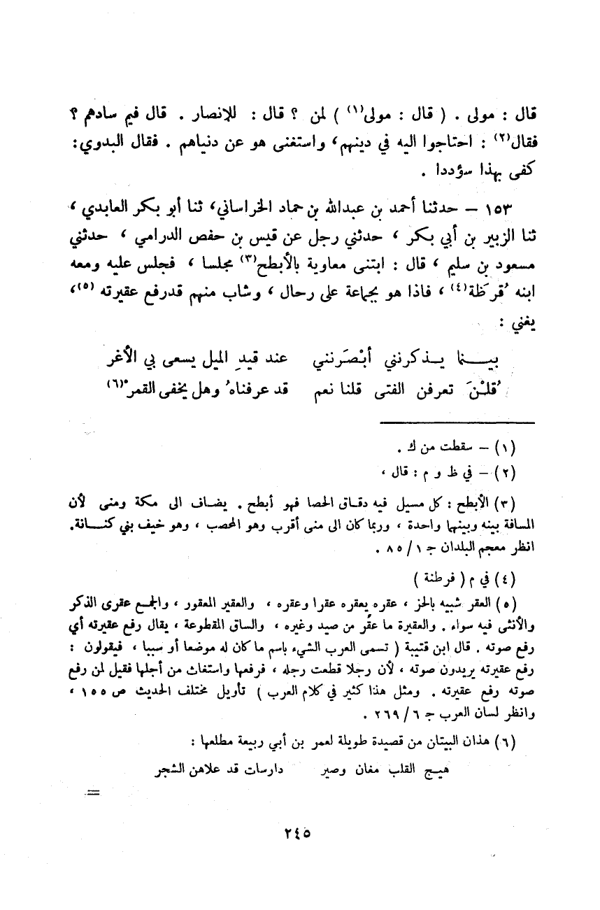 حَدَّثَنَا أَحْمَدُ بْنُ عَبْدِ اللَّهِ بْنِ حَمَّادٍ الْخُرَاسَانِيُّ، ثَنَا أَبُو بَكْرٍ الْعَابِدِيُّ، ثَنَا الزُّبَيْرُ بْنُ أَبِي بَكْرٍ، حَدَّثَنِي رَجُلٌ، عَنْ قَيْسِ بْنِ حَفْصٍ الدَّارِمِيُّ، حَدَّثَنِي مَسْعُودُ بْنُ سُلَيْمٍ قَالَ: ابْتَنَى مُعَاوِيَةُ بِالْأَبْطَحِ مَجْلِسًا، فَجَلَسَ عَلَيْهِ وَمَعَهُ ابْنُهُ قَرَظَةُ، فَإِذَا هُوَ بِجَمَاعَةٍ عَلَى رِحَالٍ، وَشَابٌّ مِنْهُمْ قَدْ رَفَعَ عَقِيرَتَهُ يُغَنِّي:
