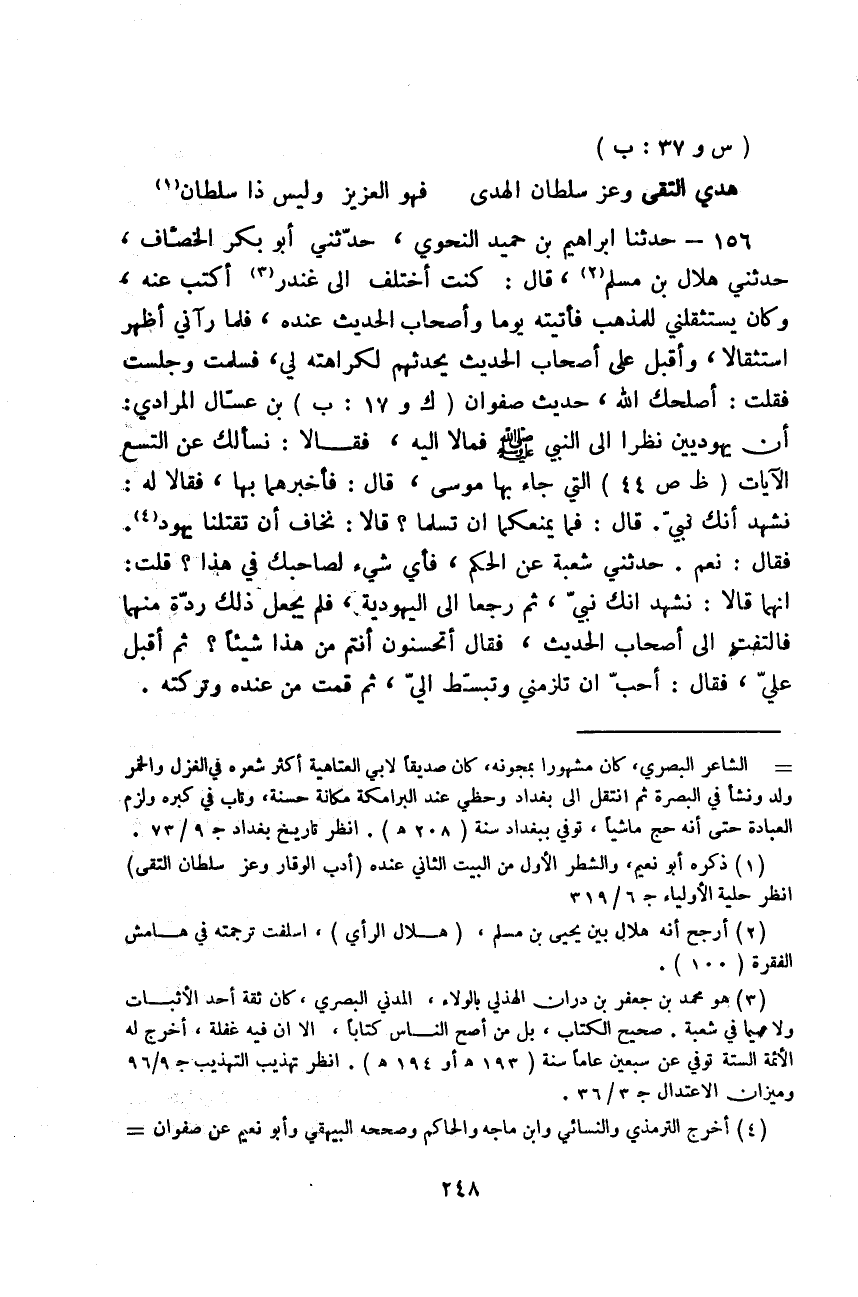 حَدَّثَنَا إِبْرَاهِيمُ بْنُ حُمَيْدٍ النَّحْوِيُّ، حَدَّثَنِي أَبُو بَكْرٍ الْخِصَافُ، حَدَّثَنِي هِلَالُ بْنُ مُسْلِمٍ قَالَ: كُنْتُ §أَخْتَلِفُ إِلَى غُنْدَرٍ أَكْتُبُ عَنْهُ، وَكَانَ يَسْتَثْقِلُنِي لِلْمَذْهَبِ فَأَتَيْتُهُ يَوْمًا، وَأَصْحَابُ الْحَدِيثِ عِنْدَهُ، فَلَمَّا رَآنِي أَظْهَرَ اسْتِثْقَالًا، وَأَقْبَلَ عَلَى أَصْحَابِ الْحَدِيثِ يُحَدِّثُهُمْ لِكَرَاهَتِهِ لِي، فَسَلَّمْتُ وَجَلَسْتُ فَقُلْتُ: أَصْلَحَكَ اللَّهُ، حَدِيثَ صَفْوَانَ بْنِ عَسَّالٍ الْمُرَادِيِّ: أَنْ يَهُودِيَّيْنِ نَظَرَا إِلَى النَّبِيِّ صَلَّى اللهُ عَلَيْهِ وَسَلَّمَ فَمَالَا إِلَيْهِ، فَقَالَا: نَسْأَلُكَ عَنِ التِّسْعِ الْآيَاتِ الَّتِي جَاءَ بِهَا مُوسَى قَالَ: فَأَخْبَرْهُمَا بِهَا، فَقَالَا لَهُ: نَشْهَدُ أَنَّكَ نَبِيُّ قَالَ: «فَمَا يَمْنَعُكُمَا أَنْ تُسْلِمَا؟» قَالَا: نَخَافُ أَنْ تَقْتُلَنَا يَهُودُ فَقَالَ: نَعَمْ حَدَّثَنِي شُعْبَةُ، عَنِ الْحَكَمِ، فَأَيُّ شَيْءٍ لِصَاحِبِكَ فِي هَذَا؟ قُلْتُ: إِنَّهُمَا قَالَا: نَشْهَدُ أَنَّكَ نَبِيُّ، ثُمَّ رَجَعَا إِلَى الْيَهُودِيَّةِ، فَلَمْ يَجْعَلْ ذَلِكَ رِدَّةً مِنْهُمَا فَالْتَفَتَ إِلَى أَصْحَابِ الْحَدِيثِ، فَقَالَ: أَتُحْسِنُونَ أَنْتُمْ مِنْ هَذَا شَيْئًا؟ ثُمَّ أَقْبَلَ عَلَيَّ، فَقَالَ: أُحِبُّ أَنْ تَلْزَمَنِي وَتَبَسَّطَ إِلَيَّ، ثُمَّ قُمْتُ مِنْ عِنْدِهِ وَتَرَكْتُهُ "