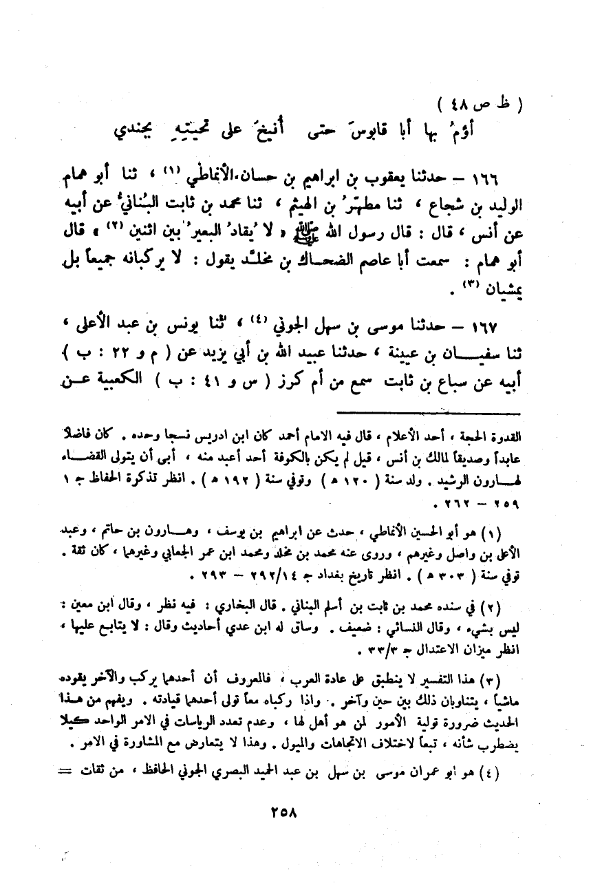حَدَّثَنَا يَعْقُوبُ بْنُ إِبْرَاهِيمَ بْنِ حَسَّانَ الْأَنْمَاطِيُّ، ثَنَا أَبُو هَمَّامٍ الْوَلِيدُ بْنُ شُجَاعٍ، ثَنَا مُطَهَّرُ بْنُ الْهَيْثَمِ، ثَنَا مُحَمَّدُ بْنُ ثَابِتٍ الْبُنَانِيُّ، عَنْ أَبِيهِ، عَنْ أَنَسٍ قَالَ: قَالَ رَسُولُ اللَّهِ صَلَّى اللهُ عَلَيْهِ وَسَلَّمَ: «§لَا يُقَادُ الْبَعِيرُ بَيْنَ اثْنَيْنِ» قَالَ أَبُو هَمَّامٍ: سَمِعْتُ أَبَا عَاصِمٍ الضَّحَّاكَ بْنَ مَخْلَدٍ يَقُولُ: لَا يَرْكَبَانِهِ جَمِيعًا بَلْ يَمْشِيَانِ