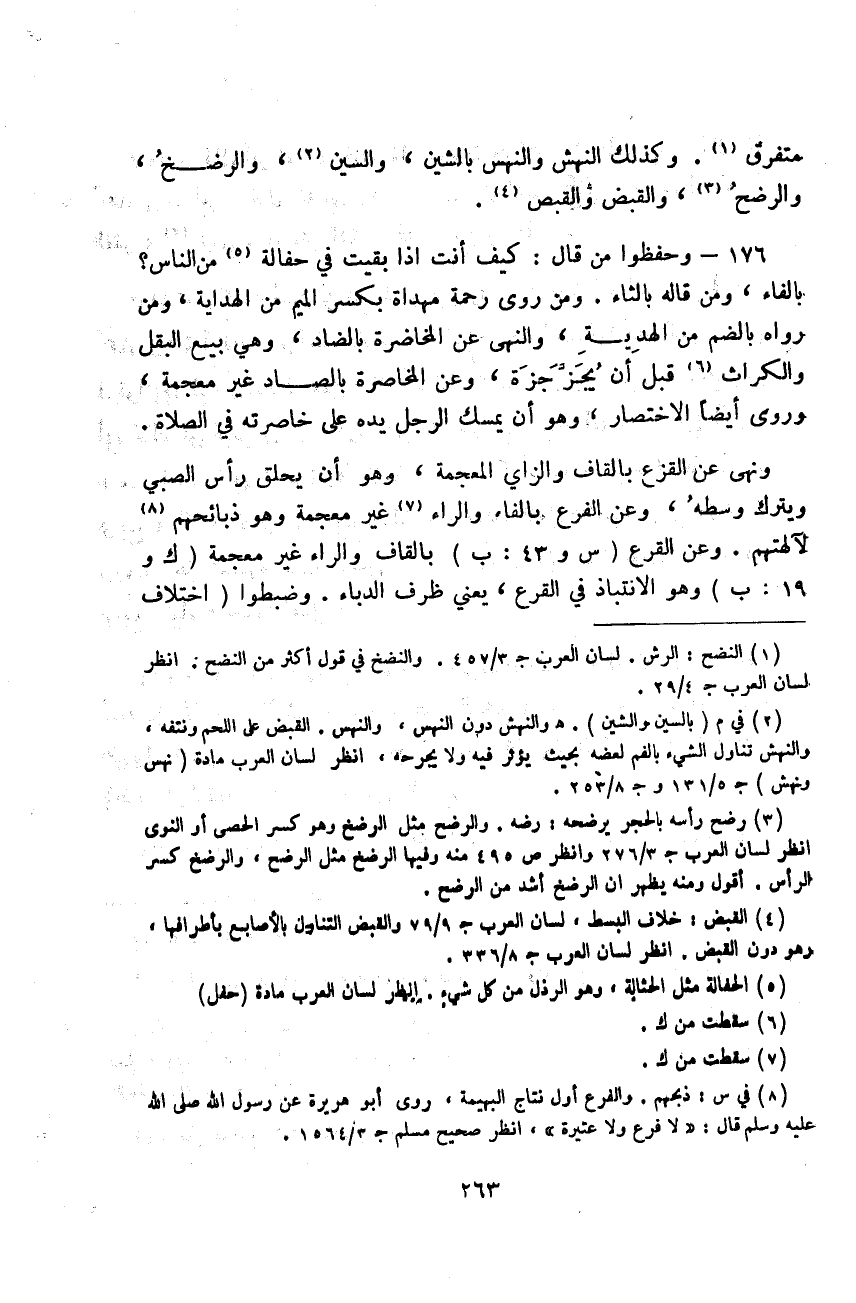 مُتَفَرِّقٌ وَكَذَلِكَ النَّهْشِ وَالنَّهْسِ بِالشِّينِ، وَالسِّينِ، وَالرَّضْخِ وَالرَّضْحِ، وَالْقَبْضِ وَالْقَبْصِ وَحَفَظُوا مَنْ قَالَ: كَيْفَ أَنْتَ إِذَا بَقِيَتَ فِي حُفَالَةٍ مِنَ النَّاسِ؟ بِالْفَاءِ، وَمَنْ قَالَهُ بِالثَّاءِ وَمَنْ رَوَى رَحْمَةً مِهْدَاةً بِكَسْرِ الْمِيمِ مِنَ الْهِدَايَةِ، وَمَنْ رَوَاهُ بِالضَّمِّ مِنَ الْهَدِيَّةِ، وَالنَّهْيِ عَنِ الْمُخَاضَرةِ بِالضَّادِ، ووَهِيَ بَيْعُ الْبَقْلِ وَالْكُرَّاثِ قَبْلَ أَنْ يُجَزَّ جَزُّهُ , وَعَنِ الْمُخَاصَرَةِ بِالصَّادِ غَيْرِ مُعْجَمَةٍ، وَرُوِيَ أَيْضًا الِاخْتِصَارُ، وَهُوَ أَنْ يُمْسِكَ الرَّجُلُ يَدَهُ عَلَى خَاصِرَتِهِ فِي الصَّلَاةِ «وَنَهَى عَنِ الْقَزْعِ» بِالْقَافِ وَالزَّايِ الْمُعْجَمَةِ، وَهُوَ أَنْ يَحْلِقَ رَأْسَ الصَّبِيِّ، وَيَتْرُكَ وَسْطَهُ، وَعَنِ الْفَرَعِ بِالْفَاءِ وَالرَّاءِ غَيْرِ مُعْجَمَةٍ، وَهُوَ ذَبَائِحُهُمْ لِآلِهَتِمْ وَعَنِ الْقَرْعِ بِالْقَافِ وَالرَّاءِ غَيْرِ مُعْجَمَةٍ، وَهُوَ الِانْتِبَاذُ فِي الْقَرْعِ، يَعْنِي ظَرْفَ الدُّبَّاءِ وَضَبَطُوا اخْتِلَافَ