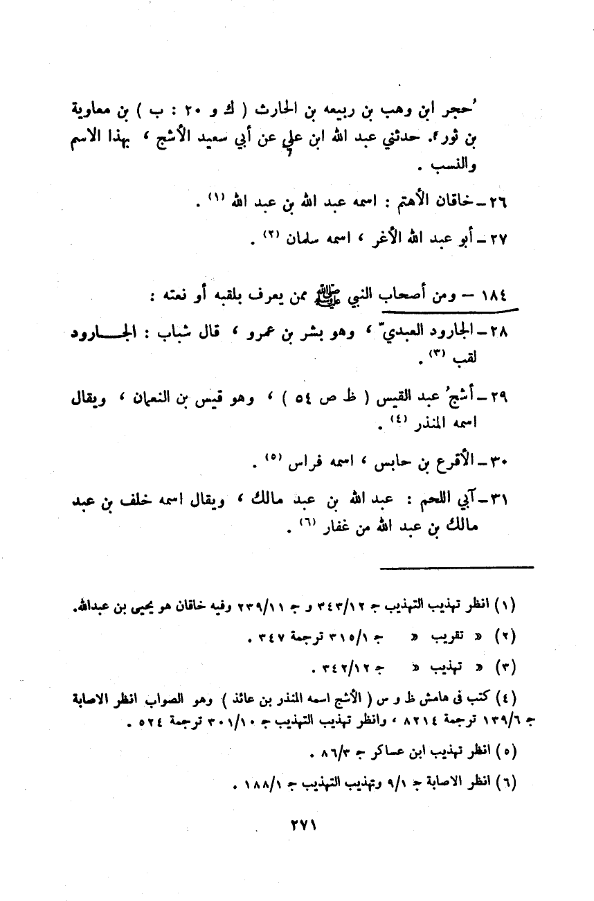 §وَمِنْ أَصْحَابِ النَّبِيِّ صَلَّى اللهُ عَلَيْهِ وَسَلَّمَ مِمَّنْ يُعْرَفُ بِلَقَبِهِ أَوْ نَعْتِهِ الْجَارُودُ الْعَبْدِيُّ، وَهُوَ بِشْرُ بْنُ عَمْرٍو، قَالَ شَبَابٌ: الْجَارُودُ لَقَبٌ أَشَجُّ عَبْدُ الْقَيْسِ، وَهُوَ قَيْسُ بْنُ النُّعْمَانِ، وَيُقَالُ اسْمُهُ الْمُنْذِرُ، الْأَقْرَعُ بْنُ حَابِسٍ، اسْمُهُ فِرَاسٌ آبِي اللَّحْمِ عَبْدُ اللَّهِ بْنُ عَبْدِ مَالِكٍ، وَيُقَالُ اسْمُهُ خَلَفُ بْنُ عَبْدِ مَالِكِ بْنِ عَبْدِ اللَّهِ مِنْ غِفَارٍ -[272]- شُقْرَانُ مَوْلَى رَسُولِ اللَّهِ صَلَّى اللهُ عَلَيْهِ وَسَلَّمَ اسْمُهُ بَلْجٌ يَقُولُهُ شَبَابٌ، وَقَالَ أَبُو حَفْصٍ اسْمُهُ صَالِحٌ، سُفَيْنَةُ مَوْلَى رَسُولِ اللَّهِ صَلَّى اللهُ عَلَيْهِ وَسَلَّمَ اسْمُهُ صَالِحٌ، يَقُولُهُ شَبَابٌ، وَهُوَ مَوْلَى أُمِّ سَلَمَةَ