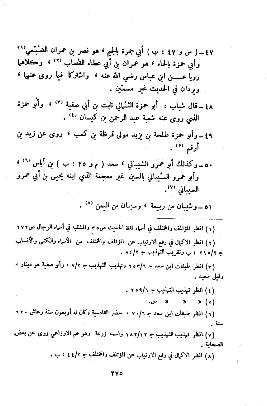 : أَبِي جَمْرَةَ بِالْجِيمِ، هُوَ نَصْرُ بْنُ عِمْرَانَ الضُّبَعِيُّ، وَأَبِي حَمْزَةَ بِالْحَاءِ، هُوَ عِمْرَانُ بْنُ أَبِي عَطَاءٍ الْقَصَّابُ، وَكِلَاهُمَا رَوَيَا عَنِ ابْنِ عَبَّاسٍ رَضِيَ اللَّهُ عَنْهُ، وَاشْتَرَكَا فِيمَا رَوَى عَنْهُمَا، وَيَرِدَانِ فِي الْحَدِيثِ غَيْرُ مُسَمَّيْنِ قَالَ شَبَابٌ: أَبُو حَمْزَةَ الثُّمَالِيُّ ثَابِتُ بْنُ أَبِي صَفِيَّةَ، وَأَبُو حَمْزَةَ الَّذِي رَوَى عَنْهُ شُعْبَةُ: عَبْدُ الرَّحْمَنِ بْنُ كَيْسَانَ وَأَبُو حَمْزَةَ طَلْحَةُ بْنُ يَزِيدَ مَوْلَى قَرَظَةَ بْنِ كَعْبٍ، رَوَى عَنْ زَيْدِ بْنِ أَرْقَمَ وَكَذَلِكَ أَبُو عَمْرٍو الشَّيْبَانِيُّ سَعْدُ بْنُ إِيَاسَ، وَأَبُو عَمْرٍو السَّيْبَانِيُّ بِالسِّينِ غَيْرِ مُعْجَمَةِ الَّذِي ابْنُهُ يَحْيَى بْنُ أَبِي عَمْرٍو السَّيْبَانِيُّ وَشَيْبَانُ مِنْ رَبِيعَةَ، وَسَيْبَانُ مِنَ الْيَمَنِ