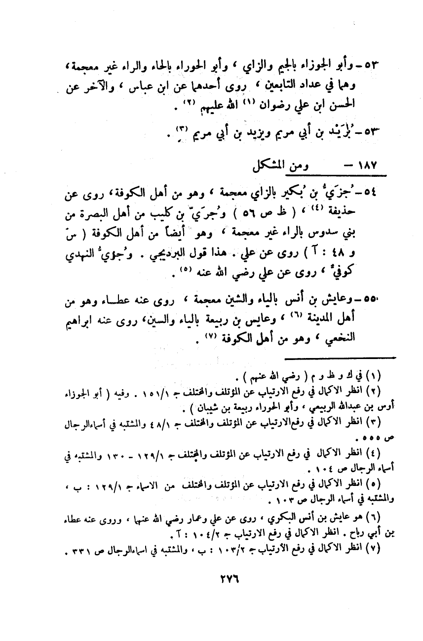 §وَمِنَ الْمُشْكِلِ جُزَيُّ بْنُ بُكَيْرٍ بِالزَّايِ مُعْجَمَةٍ، وَهُوَ مِنْ أَهْلِ الْكُوفَةِ، رَوَى عَنْ حُذَيْفَةَ، وَجُرَيُّ بْنُ كُلَيْبٍ مِنْ أَهْلِ الْبَصْرَةِ مِنْ بَنِي سَدُوسٍ بِالرَّاءِ غَيْرِ مُعْجَمَةٍ، وَهُوَ أَيْضًا مِنْ أَهْلِ الْكُوفَةِ رَوَى عَنْ عَلِيٍّ هَذَا قَوْلُ الْبَرْدِيجِيِّ وَجُزَيُّ النَّهْدِيُّ كُوفِيُّ، رَوَى عَنْ عَلِيٍّ رَضِيَ اللَّهُ عَنْهُ وَعَايِشُ بْنُ أَنَسٍ بِالْيَاءِ وَالشِّينِ مُعْجَمَةٍ، رَوَى عَنْهُ عَطَاءٌ وَهُوَ مِنْ أَهْلِ الْمَدِينَةِ، وَعَايِسُ بْنُ رَبِيعَةَ بِالْيَاءِ وَالسِّينِ، رَوَى عَنْهُ إِبْرَاهِيمُ النَّخَعِيُّ، وَهُوَ مِنْ أَهْلِ الْكُوفَةِ