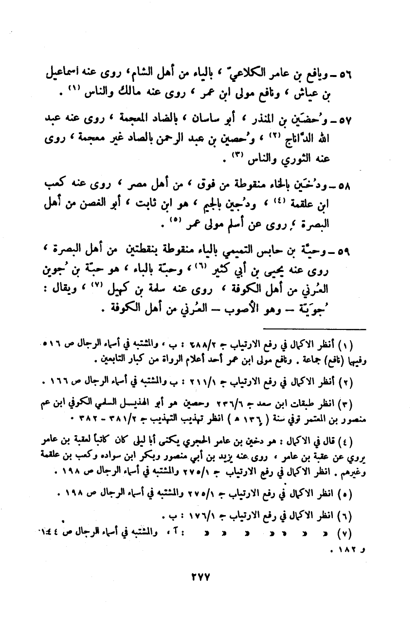 وَيَافِعُ بْنُ عَامِرٍ الْكَلَاعِيُّ، بِالْيَاءِ مِنْ أَهْلِ الشَّامِ، رَوَى عَنْهُ إِسْمَاعِيلُ بْنُ عَيَّاشٍ، وَنَافِعٌ مَوْلَى ابْنِ عُمَرَ، رَوَى عَنْهُ مَالِكٌ وَالنَّاسُ وَحُضَيْنُ بْنُ الْمُنْذِرِ أَبُو سَاسَانَ، بِالضَّادِ الْمُعْجَمَةِ، رَوَى عَنْهُ عَبْدُ اللَّهِ الدَّانَاجُ، وَحُصَيْنُ بْنُ عَبْدِ الرَّحْمَنِ بِالصَّادِ غَيْرِ مُعْجَمَةٍ، رَوَى عَنْهُ الثَّوْرِيُّ وَالنَّاسُ وَدُخَيْنُ بِالْخَاءِ مَنْقُوطَةٍ مِنْ فَوْقٍ، مِنْ أَهْلِ مِصْرَ، رَوَى عَنْهُ كَعْبُ بْنُ عَلْقَمَةَ، وَدُجَيْنُ بِالْجِيمِ، هُوَ ابْنُ ثَابِتٍ أَبُو الْغُصْنِ مِنْ أَهْلِ الْبَصْرَةِ، رَوَى عَنْ أَسْلَمَ مَوْلَى عُمَرَ وَحَيَّةُ بْنُ حَابِسٍ التَّمِيمِيُّ بِالْيَاءِ مَنْقُوطَةٌ بِنُقْطَتَيْنِ مِنْ أَهْلِ الْبَصْرَةِ، رَوَى عَنْهُ يَحْيَى بْنُ أَبِي كَثِيرٍ، وَحَبَّةُ بِالْبَاءِ، هُوَ حَبَّةُ بْنُ جُوَيْنٍ الْعُرَنِيُّ مِنْ أَهْلِ الْكُوفَةِ، رَوَى عَنْهُ سَلَمَةُ بْنُ كُهَيْلٍ، وَيُقَالُ: جُوَيَّةُ وَهُوَ الْأَصْوَبُ الْعُرَنِيُّ مِنْ أَهْلِ الْكُوفَةِ