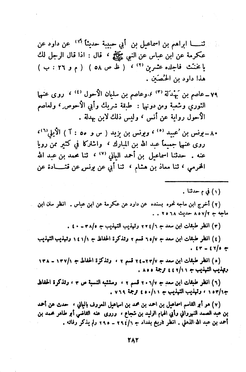 حَدَّثَنَا إِسْمَاعِيلُ بْنُ أَحْمَدَ الْيَمَانِيُّ، ثَنَا مُحَمَّدُ بْنُ عَبْدِ اللَّهِ الْمُخَرِّمِيُّ، ثَنَا مُعَاذُ بْنُ هِشَامٍ، ثَنَا أَبِي، عَنْ يُونُسَ، عَنْ قَتَادَةَ، عَنْ -[283]- أَنَسِ بْنِ مَالِكٍ، قَالَ: " §مَا أَكَلَ النَّبِيُّ صَلَّى اللهُ عَلَيْهِ وَسَلَّمَ عَلَى خِوَانٍ، وَلَا فِي سُكُرُّجَةَ، وَلَا خُبِزَ لَهُ مُرَقَّقٌ قُلْتُ لِقَتَادَةَ: عَلَامَ كَانُوا يَأْكُلُونَ؟ قَالَ: عَلَى السُّفَرِ قَالَ: فَهَذَا يُونُسُ الْإِسْكَافُ مَنْصُورُ بْنُ الْمُعْتَمِرِ، وَمَنْصُورُ بْنُ زَاذَانَ، رَوَى عَنْهُمَا جَمِيعًا شُعْبَةُ، وَسُفْيَانُ وَمَنْ بَعْدِهِمَا: طَبَقَةُ هُشَيْمٍ، وَرَوَيَا جَمِيعًا، عَنْ إِبْرَاهِيمَ وَالشَّعْبِيِّ وَغَيْرِهِمَا أَيُّوبُ السَّخْتِيَانِيُّ، وَأَيُّوبُ بْنُ مُوسَى، رَوَيَا جَمِيعًا، عَنْ نَافِعٍ، رَوَى عَنْهُمَا شُعْبَةُ وَسُفْيَانُ -[284]- مَالِكُ بْنُ مِغْوَلٍ، وَمَالِكُ بْنُ أَنَسٍ، رَوَى عَنْهُمَا جَمِيعًا أَبُو عَاصِمٍ، وَابْنُ مِغْوَلٍ أَكْبَرُ وَأَقْدَمُ، مَاتَ مَالِكُ بْنُ مِغْوَلٍ سَنَةَ نَيِّفٍ وَخَمْسِينَ وَمِائَةٍ، وَمَاتَ مَالِكُ بْنُ أَنَسٍ سَنَةَ تِسْعٍ وَسَبْعِينَ وَمِائَةٍ حَمَّادُ بْنُ سَلَمَةَ وَحَمَّادُ بْنُ زَيْدٍ، رَوَيَا عَنْ ثَابِتٍ، وَدَاوُدُ، وَأَيُّوبُ، وَالتَّيْمِيُّ، وَرَوَى عَنْهُمَا أَهْلُ عَصْرِ سَنَةِ ثَلَاثِينَ، وَابْنُ سَلَمَةَ أَكْبَرُ وَأَقْدَمُ مَاتَ حَمَّادُ بْنُ سَلَمَةَ فِي ذِي الْحِجَّةِ سَنَةَ سَبْعٍ وَسِتِّينَ وَمِائَةٍ، وَمَاتَ حَمَّادُ بْنُ زَيْدٍ فِي شَهْرِ رَمَضَانَ سَنَةَ تِسْعٍ وَسَبْعِينَ وَمِائَةٍ أَنَا الْقَاضِي أَبُو مُحَمَّدٍ الْحَسَنُ بْنُ عَبْدِ الرَّحْمَنِ بْنِ خَلَّادٍ الرَّامَهُرْمُزِيُّ قَالَ: إِذَا قَالَ عَارِمٌ: حَدَّثَنَا حَمَّادٌ، فَهُوَ حَمَّادُ بْنُ زَيْدٍ وَكَذَلِكَ سُلَيْمَانُ بْنُ حَرْبٍ، وَإِذَا قَالَ: التَّبُوذَكِيُّ: حَدَّثَنَا حَمَّادٌ، فَهُوَ حَمَّادُ بْنُ سَلَمَةَ، وَكَذَلِكَ الْحَجَّاجُ بْنُ مِنْهَالٍ وَإِذَا قَالَ عَفَّانُ: ثَنَا حَمَّادٌ أَمْكَنَ أَنْ يَكُونَ أَحَدُهُمَا