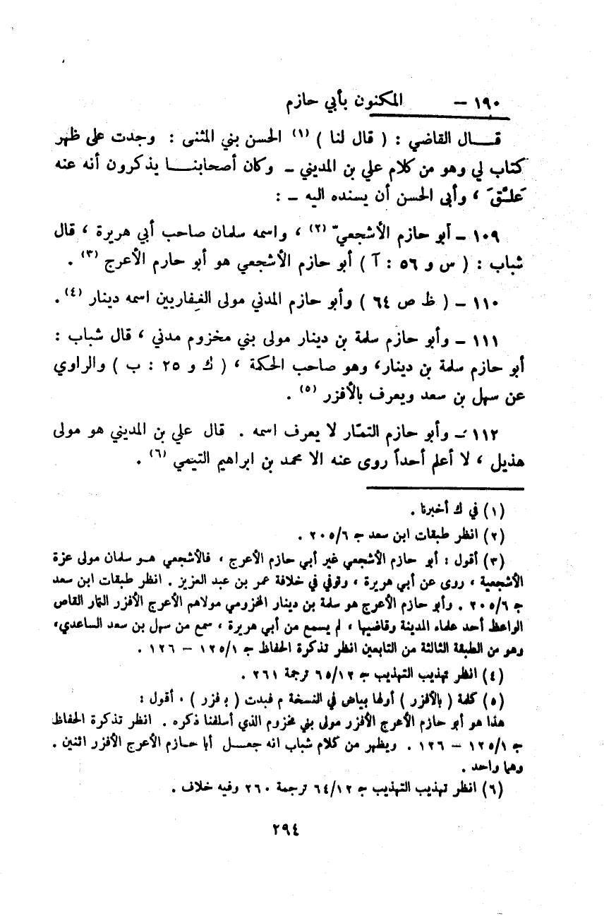 §الْمُكَنُّونَ بِأَبِي حَازِمٍ قَالَ الْقَاضِي: قَالَ لَنَا الْحَسَنُ بْنُ الْمُثَنَّى: وَجَدْتُ عَلَى ظَهْرِ كِتَابٍ لِي وَهُوَ مِنْ كَلَامِ عَلِيِّ بْنِ الْمَدِينِيِّ - وَكَانَ أَصْحَابُنَا يَذْكُرُونَ أَنَّهُ عَنْهُ عَلَّقَ، وَأَبَى الْحَسَنِ أَنْ يُسْنِدَهُ إِلَيْهِ -: أَبُو حَازِمٍ الْأَشْجَعِيُّ، وَاسْمُهُ سَلْمَانُ صَاحِبُ أَبِي هُرَيْرَةَ، قَالَ شَبَابٌ: أَبُو حَازِمٍ الْأَشْجَعِيُّ هُوَ أَبُو حَازِمٍ الْأَعْرَجُ وَأَبُو حَازِمٍ الْمَدَنِيُّ مَوْلَى الْغِفَارِيِينَ اسْمُهُ دِينَارٌ وَأَبُو حَازِمٍ سَلَمَةُ بْنُ دِينَارٍ مَوْلَى بَنِي مَخْزُومٍ مَدَنِيُّ، قَالَ شَبَابٌ: أَبُو حَازِمٍ سَلَمَةُ بْنُ دِينَارٍ، وَهُوَ صَاحِبُ الْحِكْمَةِ، وَالرَّاوِي عَنْ سَهْلِ بْنِ سَعْدٍ وَيُعْرَفُ بِالْأَفْزَرِ وَأَبُو حَازِمٍ التَّمَّارُ لَا يُعْرَفُ اسْمُهُ قَالَ عَلِيُّ بْنُ الْمَدِينِيِّ: هُوَ مَوْلَى هُذَيْلٍ، لَا أَعْلَمُ أَحَدًا رَوَى عَنْهُ إِلَّا مُحَمَّدُ بْنُ إِبْرَاهِيمَ التَّيْمِيُّ