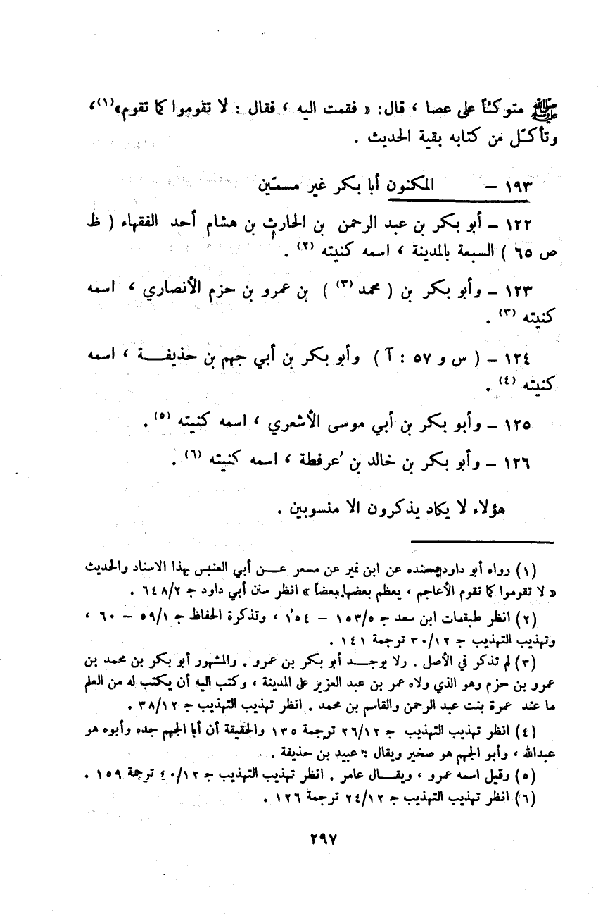 §الْمُكَنُّونَ أَبَا بَكْرٍ غَيْرَ مُسَمَّيْنِ أَبُو بَكْرِ بْنُ عَبْدِ الرَّحْمَنِ بْنِ الْحَارِثِ بْنِ هِشَامٍ أَحَدُ الْفُقَهَاءِ السَّبْعَةِ بِالْمَدِينَةِ، اسْمُهُ كُنْيَتُهُ، وَأَبُو بَكْرِ بْنُ مُحَمَّدِ بْنِ عَمْرِو بْنِ حَزْمٍ الْأَنْصَارِيُّ، اسْمُهُ كُنْيَتُهُ، وَأَبُو بَكْرِ بْنُ أَبِي جَهْمِ بْنِ حُذَيْفَةَ، اسْمُهُ كُنْيَتُهُ، وَأَبُو بَكْرِ بْنُ أَبِي مُوسَى الْأَشْعَرِيُّ، اسْمُهُ كُنْيَتُهُ، وَأَبُو بَكْرِ بْنُ خَالِدِ بْنِ عُرْفُطَةَ، اسْمُهُ كُنْيَتُهُ، هَؤُلَاءِ لَا يَكَادُ يُذْكَرُونَ إِلَّا مَنْسُوبِينَ -[298]-، وَأَبُو بَكْرِ بْنُ عُتْبَةَ بْنِ أَبِي وَقَّاصٍ، وَمِمَّنْ يَتَأَخَّرُ عَنْ عَصْرِ هَؤُلَاءِ: أَبُو بَكْرِ بْنُ سَالِمِ بْنِ عَبْدِ اللَّهِ بْنِ عُمَرَ، اسْمُهُ كُنْيَتُهُ، أَبُو بَكْرِ بْنُ حَفْصِ بْنِ عُمَرَ، اسْمُهُ كُنْيَتُهُ، أَبُو بَكْرِ بْنُ عُمَرَ بْنِ عَبْدِ الرَّحْمَنِ بْنِ عَبْدِ اللَّهِ بْنِ عُمَرَ، اسْمُهُ كُنْيَتُهُ، أَبُو بَكْرِ بْنُ أَبِي مَرْيَمَ، اسْمُهُ كُنْيَتُهُ