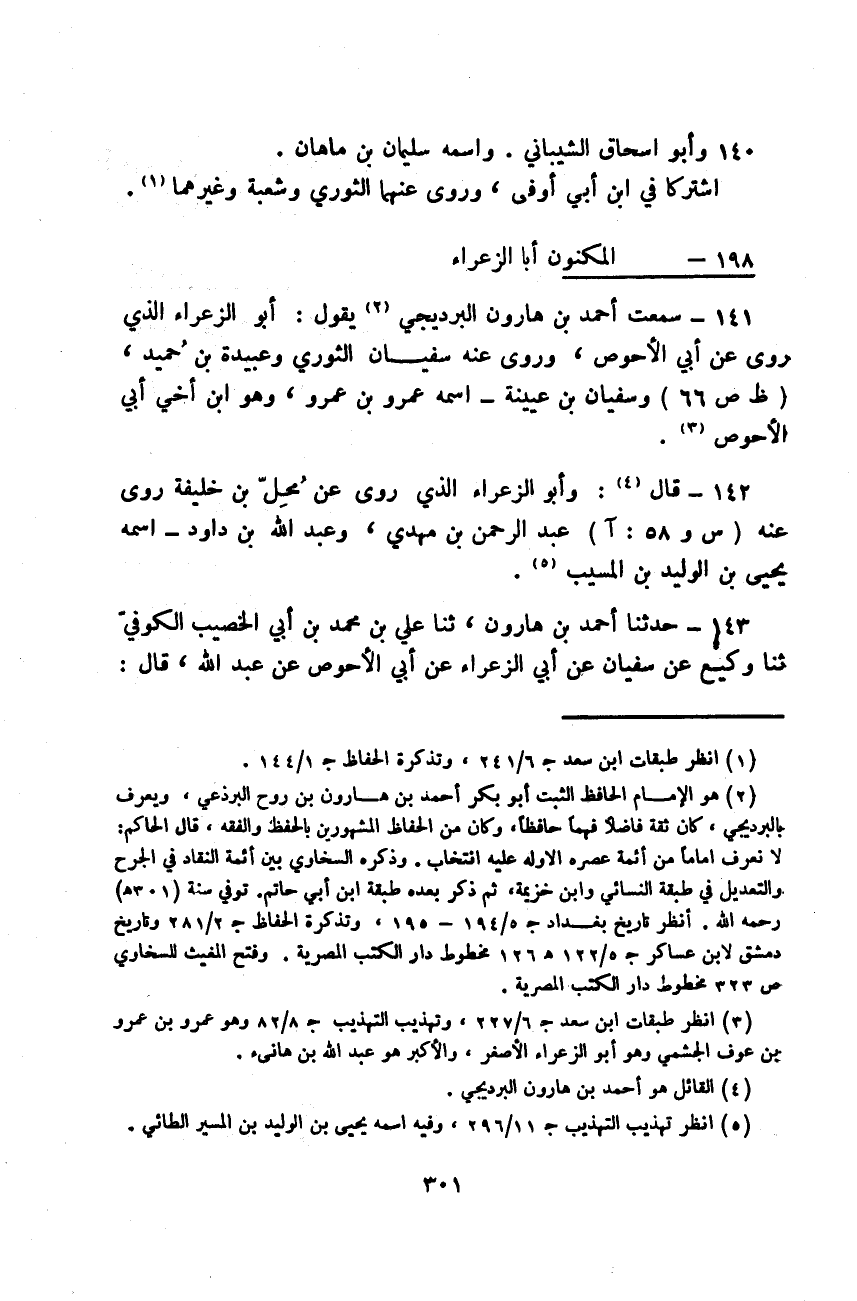 §الْمُكَنُّونَ أَبَا الزَّعْرَاءِ سَمِعْتُ أَحْمَدَ بْنَ هَارُونَ الْبَرْدِيجِيَّ يَقُولُ: أَبُو الزَّعْرَاءِ الَّذِي رَوَى عَنْ أَبِي الْأَحْوَصِ، وَرَوَى عَنْهُ سُفْيَانُ الثَّوْرِيُّ وَعُبَيْدَةُ بْنُ حُمَيْدٍ، وَسُفْيَانُ بْنُ عُيَيْنَةَ، اسْمُهُ عَمْرُو بْنُ عَمْرٍو، وَهُوَ ابْنُ أَخِي أَبِي الْأَحْوَصِ، قَالَ: وَأَبُو الزَّعْرَاءِ الَّذِي رَوَى عَنْ مُحِلِّ بْنِ خَلِيفَةَ، رَوَى عَنْهُ عَبْدُ الرَّحْمَنِ بْنُ مَهْدِيٍّ، وَعَبْدُ اللَّهِ بْنُ دَاوُدَ، اسْمُهُ يَحْيَى بْنُ الْوَلِيدِ بْنِ الْمُسَيَّبِ