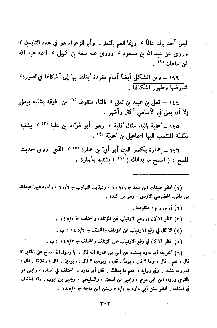 §وَمِنَ الْمُشْكِلِ أَيْضًا أَسَامٍ مُفْرَدَةٌ يُغْلَطُ بِهَا إِلَى أَشْكَالِهَا فِي الصُّورَةِ، لِغُمُوضِهَا وَظُهُورِ إِشْكَالِهَا تَعْلَى بْنُ عُبَيْدِ بْنِ تَعْلَى، بِالتَّاءِ مَنْقُوطٌ مِنْ فَوْقِهِ يَشْتَبِهُ بِيَعْلَى إِلَّا أَنَّ يَعْلَى فِي الْأَسَامِي أَكْثَرُ وَأَشْهُرُ عُلْبَةُ بِالْبَاءِ مِثَالُ قُلْبَةُ، وَهُوَ أَبُو ذَوَّادِ بْنُ عُلْبَةَ، يَشْتَبِهُ بِعُلَيَّةَ الْمُنْتَسِبُ إِلَيْهَا إِسْمَاعِيلُ بْنُ عُلَيَّةَ، عِمَارَةُ بِكَسْرِ الْعَيْنِ أَبُو أُبَيِّ بْنُ عِمَارَةَ، الَّذِي رَوَى حَدِيثَ الْمَسْحِ: «امْسَحْ مَا بَدَا لَكَ» يَشْتَبِهُ بِعُمَارَةَ