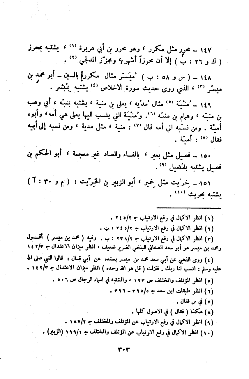 مُحَرَّرٍ مِثْلُ مُكَرَّرٍ، وَهُوَ مُحَرَّرُ بْنُ أَبِي هُرَيْرَةَ، يَشْتَبِهُ بِمُحَرَّزٍ، إِلَّا أَنَّ مُحَرَّزًا أَشْهُرُ، وَمُجَزَّزٌ الْمُدْلِجِيُّ مُيَسَّرٌ مِثَالُ مُكَرَّرِ بِالسِّينِ، أَبُو مُحَمَّدِ بْنُ مُيَسَّرٍ، الَّذِي رَوَى حَدِيثَ سُورَةِ الْإِخْلَاصِ، يَشْتَبِهُ بِمُبَشِّرٍ مُنْيَةُ مِثَالُ مُدْيَةَ، يَعْلَى بْنُ مُنْيَةَ، يَشْتَبِهُ بِمُنَبِّهٍ أَبِي وَهْبِ بْنِ مُنَبِّهٍ، وَهَمَّامِ بْنِ مُنَبِّهٍ، وَمُنْيَةُ الَّتِي يُنْسَبُ إِلَيْهَا يَعْلَى هِيَ أُمُّهُ، وَأَبُوهُ أُمَيَّةُ وَمَنْ نَسَبَهُ إِلَى أُمِّهِ، قَالَ: مُنْيَةُ مِثْلُ مُدْيَةَ، وَمَنْ نَسَبَهُ إِلَى أَبِيهِ فَقَالَ: أُمَيَّةُ فَصِيلٌ مِثْلُ بَعِيرٍ، بِالْفَاءِ وَالصَّادِ غَيْرِ مُعْجَمَةٍ، أَبُو الْحَكَمِ بْنُ فَصِيلٍ يَشْتَبِهُ بِفَضِيلٍ خِرْيَتٌ مِثْلُ خِمْيَرٍ، أَبُو الزُّبَيْرِ بْنُ الْخِرْيَتِ يَشْتَبِهُ بِحُرَيْثٍ