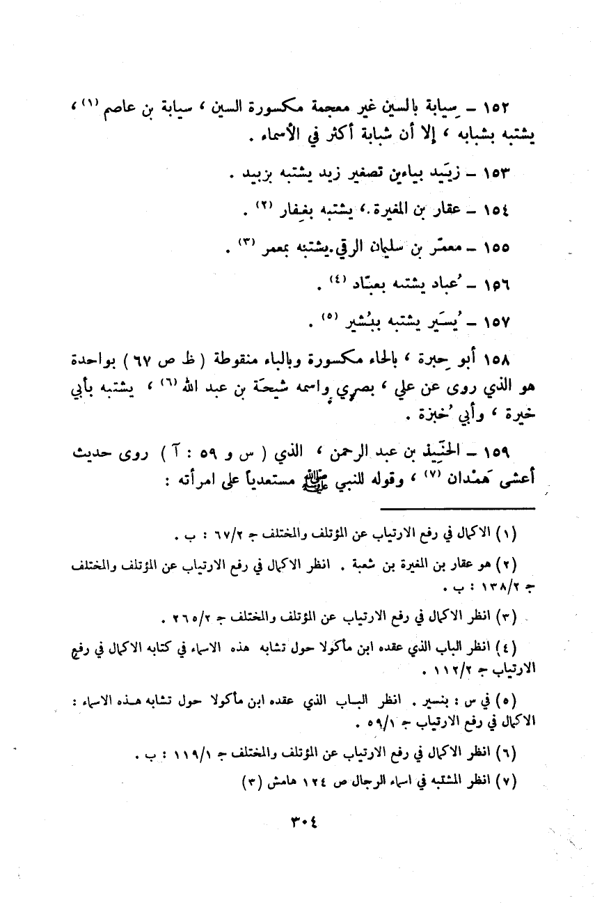 سِيَابَةُ بِالسِّينِ غَيْرِ مُعْجَمَةٍ، مَكْسُورَةِ السِّينِ، سِيَابَةُ بْنُ عَاصِمٍ، يَشْتَبِهُ بِشَبَابَةَ، إِلَّا أَنَّ شَبَابَةَ أَكْثَرُ فِي الْأَسْمَاءِ زُيَيْدُ بِيَاءَيْنِ تَصْغِيرُ زَيْدٍ، يَشْتَبِهُ بِزَبِيدٍ عَقَّارُ بْنُ الْمُغِيرَةِ، يَشْتَبِهُ بِغِفَارٍ مُعَمِّرُ بْنُ سُلَيْمَانَ الرَّقِّيُّ يَشْتَبِهُ بِمَعْمَرٍ عُبَادُ يَشْتَبِهُ بِعَبَّادٍ يَسِيرُ يَشْتَبِهُ بِبَشِيرٍ أَبُو حِبَرَةَ، بِالْحَاءِ مَكْسُورَةٍ، وَبِالْبَاءِ مَنْقُوطَةٍ بِوَاحِدَةٍ، هُوَ الَّذِي رَوَى عَنْ عَلِيٍّ، بَصَرِيُّ وَاسْمُهُ شِيحَةُ بْنُ عَبْدِ اللَّهِ، يَشْتَبِهُ بِأَبِي خَيْرَةَ، وَأَبِي خُبْزَةَ الْحَنِيذُ بْنُ عَبْدِ الرَّحْمَنِ، الَّذِي رَوَى حَدِيثَ أَعْشَى هَمْدَانَ، وَقَوْلُهُ لِلنَّبِيِّ صَلَّى اللهُ عَلَيْهِ وَسَلَّمَ مُسْتَعْدِيًا عَلَى امْرَأَتِهِ: