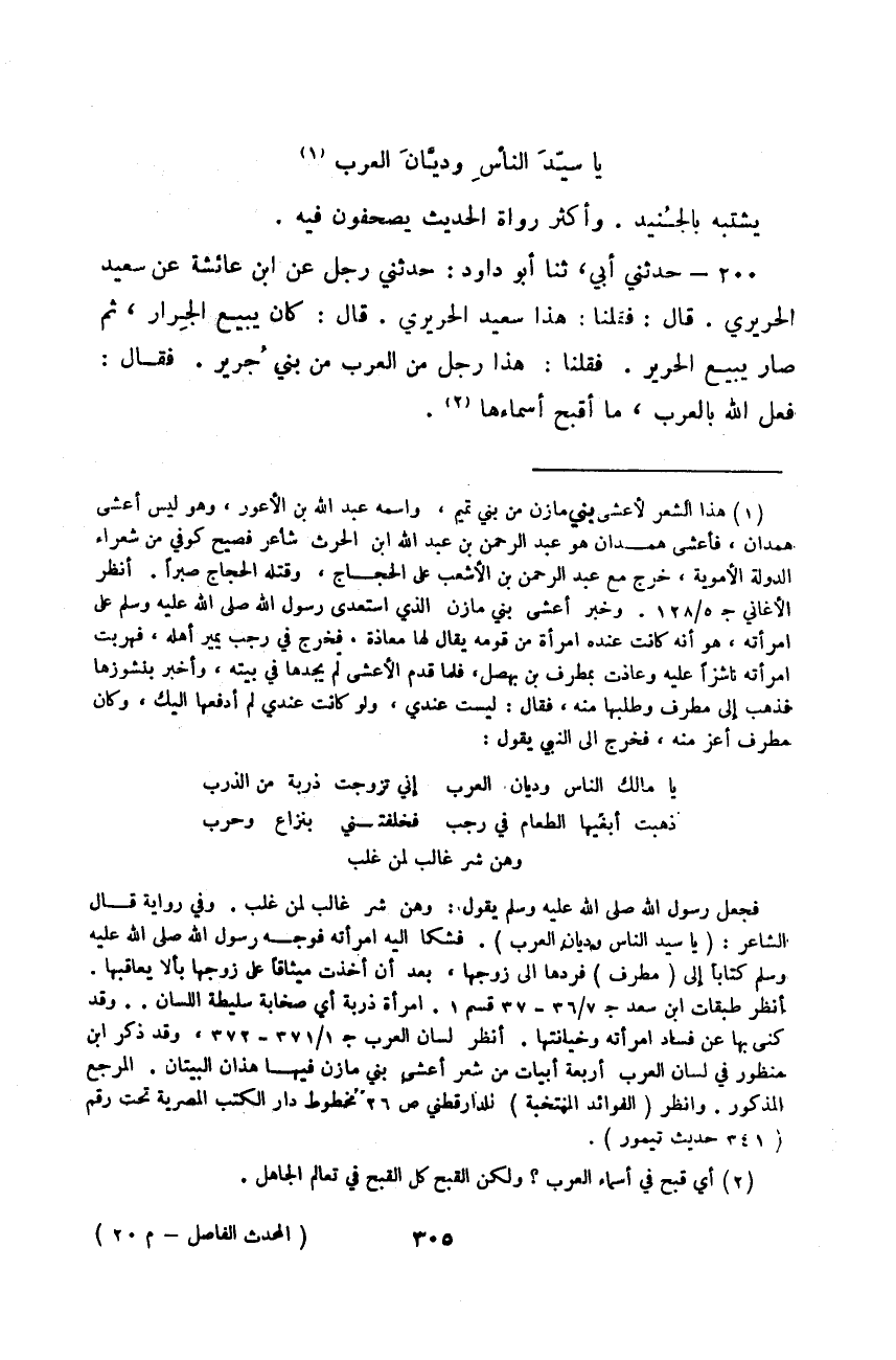حَدَّثَنَي أَبِي، ثَنَا أَبُو دَاوُدَ، حَدَّثَنِي رَجُلٌ، عَنِ ابْنِ عَائِشَةَ، عَنْ سَعِيدٍ الْحَرِيرِيِّ قَالَ: فَقُلْنَا: هَذَا سَعِيدٌ الْحَرِيرِيُّ قَالَ: كَانَ يَبِيعُ الْجِرَارَ، ثُمَّ صَارَ يَبِيعُ الْحَرِيرَ فَقُلْنَا: هَذَا رَجُلٌ مِنَ الْعَرَبِ مِنْ بَنِي جُرَيْرٍ فَقَالَ: «§فَعَلَ اللَّهُ بِالْعَرَبِ، مَا أَقْبَحَ أَسْمَاءَهَا» -[306]- سَمِعْتُ مُحَمَّدَ بْنَ جَعْفَرٍ الشَّعِيرِيَّ يَقُولُ: اطَّلَعْتُ فِي كِتَابِ رَجُلٍ مِمَّنْ زَعَمَ أَنَّهُ جَمَعَ حَدِيثَ يُونُسَ بْنِ عُبَيْدٍ، فَإِذَا قَدْ صَدْرَ بِمَا رَوَى يُونُسُ، عَنِ الزُّهْرِيِّ فَقُلْتُ: إِنَّ يُونُسَ لَمْ يَرْوِ عَنِ الزُّهْرِيِّ شَيْئًا، وَإِذَا هُوَ قَدْ غَلَطَ بِيُونُسَ بْنِ يَزِيدَ، وَظَنَّ أَنَّهُ يُونُسُ بْنُ عُبَيْدٍ