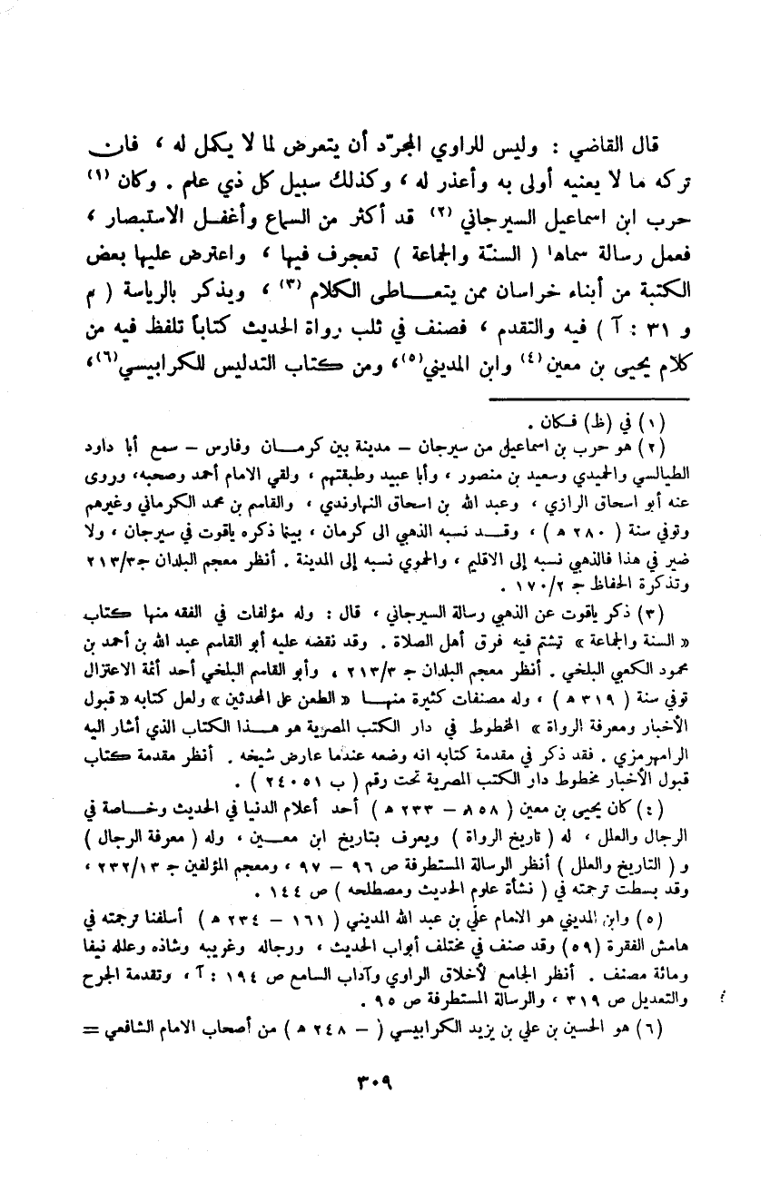 قَالَ الْقَاضِي: وَلَيْسَ لِلْرَاوِي الْمُجَرَّدِ أَنْ يَتَعَرَّفَ لَمَّا لَا يَكْمُلُ لَهُ، فَإِنَّ تَرْكَهُ مَا لَا يَعْنِيهِ أَوْلَى بِهِ وَأَعْذَرُ لَهُ، وَكَذَلِكَ سَبِيلُ كُلِّ ذِي عِلْمٍ وَكَانَ حَرْبُ بْنُ إِسْمَاعِيلَ السِّيرْجَانِيُّ، قَدْ أَكْثَرَ مِنَ السَّمَاعِ وَأَغْفَلَ الِاسْتِبْصَارَ، فَعَمِلَ رِسَالَةً سَمَّاهَا «السُّنَّةُ وَالْجَمَاعَةُ» تَعَجْرَفَ فِيهَا، وَاعْتَرَضَ عَلَيْهَا بَعْضُ الْكَتَبَةِ مِنْ أَبْنَاءِ خُرَاسَانَ مِمَّنْ يُتَعَاطَى الْكَلَامَ، وَيُذْكَرُ بِالرِّيَاسَةِ فِيهِ وَالتَّقَدُّمِ، فَصَنَّفَ فِي ثَلْبِ رُوَاةِ الْحَدِيثِ كِتَابًا تَلَفَّظَ فِيهِ مِنْ كَلَامِ يَحْيَى بْنِ مَعِينٍ وَابْنِ الْمَدِينِيِّ، وَمِنْ كِتَابِ «التَّدْلِيسِ» لِلْكَرَابِيسِيِّ