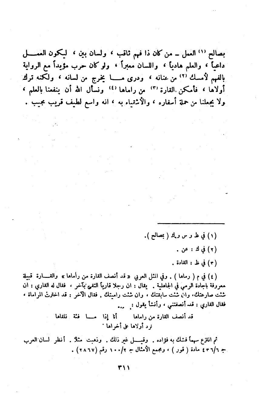 بِصَالِحِ الْعَمَلِ، مَنْ كَانَ ذَا فَهْمٍ ثَاقِبٍ، وَلِسَانٍ بَيِّنٍ، لِيَكُونَ الْعَمَلُ دَاعِيًا، وَالْعِلْمُ هَادِيًا، وَاللِّسَانُ مُعَبِّرًا، وَلَوْ كَانَ حَرْبٌ مُؤَيِّدًا مَعَهُ الرِّوَايَةَ بِالْفَهْمِ لَأَمْسَكَ مِنْ عَنَانِهِ، وَدَرَى مَا يَخْرُجُ مِنْ لِسَانِهِ، وَلَكِنَّهُ تَرَكَ أُولَاهَا، فَأَمْكَنَ الْقَارَةَ مَنْ رَامَاهَا وَنَسْأَلُ اللَّهَ أَنْ يَنْفَعَنَا بِالْعِلْمِ، وَلَا يَجْعَلْنَا مِنْ حَمَلَةِ أَسْفَارِهِ، وَالْأَشْقِيَاءِ بِهِ، إِنَّهُ وَاسِعٌ لَطِيفٌ قَرِيبٌ مُجِيبٌ