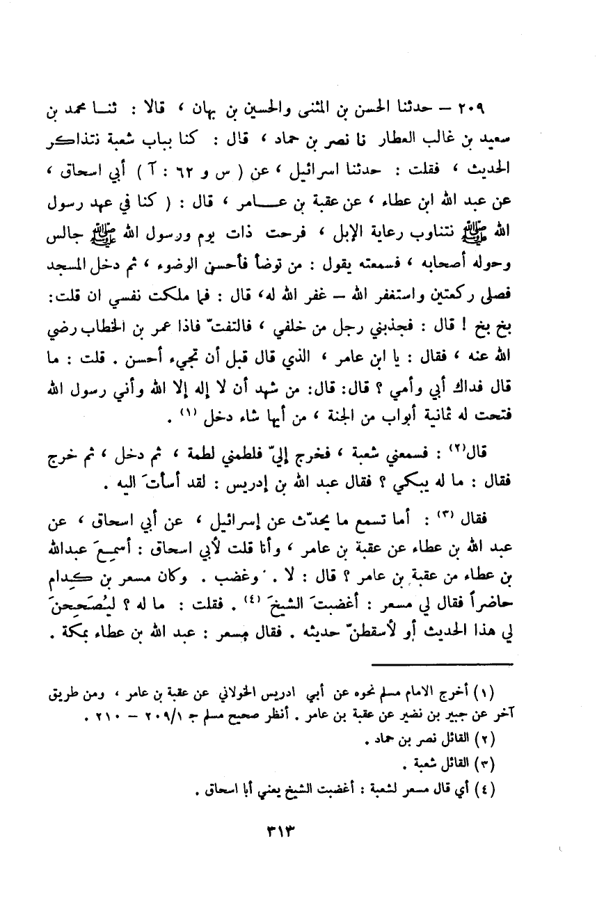 حَدَّثَنَا الْحَسَنُ بْنُ الْمُثَنَّى، وَالْحُسَيْنُ بْنُ بَهَانَ قَالَا: ثَنَا مُحَمَّدُ بْنُ سَعِيدِ بْنِ غَالِبٍ الْعَطَّارُ، نَا نَصْرُ بْنُ حَمَّادٍ قَالَ: كُنَّا بِبَابِ شُعْبَةَ نَتَذَاكَرُ الْحَدِيثَ، فَقُلْتُ: حَدَّثَنَا إِسْرَائِيلُ، عَنْ أَبِي إِسْحَاقَ، عَنْ عَبْدِ اللَّهِ بْنِ عَطَاءٍ، عَنْ عُقْبَةَ بْنِ عَامِرٍ، قَالَ: كُنَّا فِي عَهْدِ رَسُولِ اللَّهِ صَلَّى اللهُ عَلَيْهِ وَسَلَّمَ نَتَنَاوَبُ رِعَايَةَ الْإِبِلِ، فَرُحْتُ ذَاتَ يَوْمٍ، وَرَسُولُ اللَّهِ صَلَّى اللهُ عَلَيْهِ وَسَلَّمَ جَالِسٌ، وَحَوْلَهُ أَصْحَابُهُ، فَسَمِعْتُهُ يَقُولُ: «§مَنْ تَوَضَّأَ فَأَحْسَنَ الْوضُوءَ، ثُمَّ دَخَلَ الْمَسْجِدَ فَصَلَّى رَكْعَتَيْنِ وَاسْتَغْفَرَ اللَّهَ غَفَرَ اللَّهُ لَهُ» ، قَالَ: فَمَا مَلَكْتُ نَفْسِي أَنْ قُلْتُ: بَخٍ بَخٍ قَالَ: فَجَذَبَنِي رَجُلٌ مِنْ خَلْفِي، فَالْتَفَتُّ، فَإِذَا عُمَرُ بْنُ الْخَطَّابِ رَضِيَ اللَّهُ عَنْهُ فَقَالَ: يَا ابْنَ عَامِرٍ، الَّذِي قَالَ قَبْلَ أَنْ تَجِئَ أَحْسَنَ قُلْتُ: مَا قَالَ فِدَاكَ أَبِي وَأُمِّي؟ قَالَ: قَالَ: «مَنْ شَهِدَ أَنْ لَا إِلَهَ إِلَّا اللَّهُ وَأَنِّي رَسُولُ اللَّهِ فُتِحَتْ لَهُ ثَمَانِيَةُ أَبْوَابٍ مِنَ الْجَنَّةِ، مِنْ أَيِّهَا شَاءَ دَخَلَ» قَالَ: فَسَمِعَنِي شُعْبَةُ، فَخَرَجَ إِلَيَّ فَلَطَمَنِي لَطْمَةً، ثُمَّ دَخَلَ، ثُمَّ خَرَجَ، فَقَالَ: مَا لَهُ يَبْكِي؟ فَقَالَ عَبْدُ اللَّهِ بْنُ إِدْرِيسَ: لَقَدْ أَسَأْتَ إِلَيْهِ فَقَالَ: أَمَا تَسْمَعُ مَا يُحَدِّثُ عَنْ إِسْرَائِيلَ، عَنْ أَبِي إِسْحَاقَ، عَنْ عَبْدِ اللَّهِ بْنِ عَطَاءٍ، عَنْ عُقْبَةَ بْنِ عَامِرٍ، وَأَنَا قُلْتُ لِأَبِي إِسْحَاقَ: أَسَمِعَ عَبْدُ اللَّهِ بْنُ عَطَاءٍ مِنْ عُقْبَةَ بْنِ عَامِرٍ؟ قَالَ: لَا وَغَضِبَ وَكَانَ مِسْعَرُ بْنُ كِدَامٍ حَاضِرًا فَقَالَ لِي مِسْعَرٌ: أَغْضَبْتَ الشَّيْخَ فَقُلْتُ: مَا لَهُ؟ لَيُصَحِّحَنَّ لِي هَذَا الْحَدِيثَ أَوْ لَأُسْقِطَنَّ حَدِيثَهُ فَقَالَ مِسْعَرٌ: عَبْدُ اللَّهِ بْنِ عَطَاءٍ بِمَكَّةَ -[314]- فَرَحَلْتُ إِلَيْهِ لَمْ أُرِدِ الْحَجَّ، إِنَّمَا أَرَدْتُ الْحَدِيثَ، فَلَقِيتُ عَبْدَ اللَّهِ بْنَ عَطَاءٍ، فَسَأَلْتُهُ فَقَالَ: سَعْدُ بْنُ إِبْرَاهِيمَ، حَدَّثَنِي، فَقَالَ لِي مَالِكُ بْنُ أَنَسٍ: سَعْدُ بْنُ إِبْرَاهِيمَ بِالْمَدِينَةِ لَمْ يَحُجَّ الْعَامَ فَدَخَلْتُ الْمَدِينَةَ، فَلَقِيتُ سَعْدَ بْنَ إِبْرَاهِيمَ، فَسَأَلْتُهُ، فَقَالَ: الْحَدِيثُ مِنْ عِنْدِكُمْ زِيَادُ بْنُ مِخْرَاقٍ حَدَّثَنِي، فَقُلْتُ: أَيُّ شَيْءٍ، هَذَا الْحَدِيثُ؟ بَيْنَا هُوَ كُوفِيُّ صَارَ مَكِّيًّا، صَارَ مَدَنِيًّا، صَارَ بَصْرِيًّا فَدَخَلْتُ الْبَصْرَةَ، فَلَقِيتُ زِيَادَ بْنَ مِخْرَاقٍ فَسَأَلْتُهُ، فَقَالَ: لَيْسَ هَذَا مِنْ بَابَتِكَ قُلْتُ: بَلَى قَالَ: لَا تُرِيدُهُ قُلْتُ أُرِيدُهُ قَالَ: شَهْرُ بْنُ حَوْشَبٍ، حَدَّثَنِي عَنْ أَبِي رَيْحَانَةَ، عَنْ عُقْبَةَ بْنِ عَامِرٍ -[315]- قَالَ: فَلَمَّا ذَكَرَ لِي شَهْرًا، قُلْتُ: دَمَّرَ عَلِيٌّ هَذَا الْحَدِيثَ، لَوْ صَحَّ لِي هَذَا الْحَدِيثُ، كَانَ أَحَبَّ إِلَيَّ مِنْ أَهْلِي وَمِنْ مَالِي وَمِنَ الدُّنْيَا كُلِّهَا