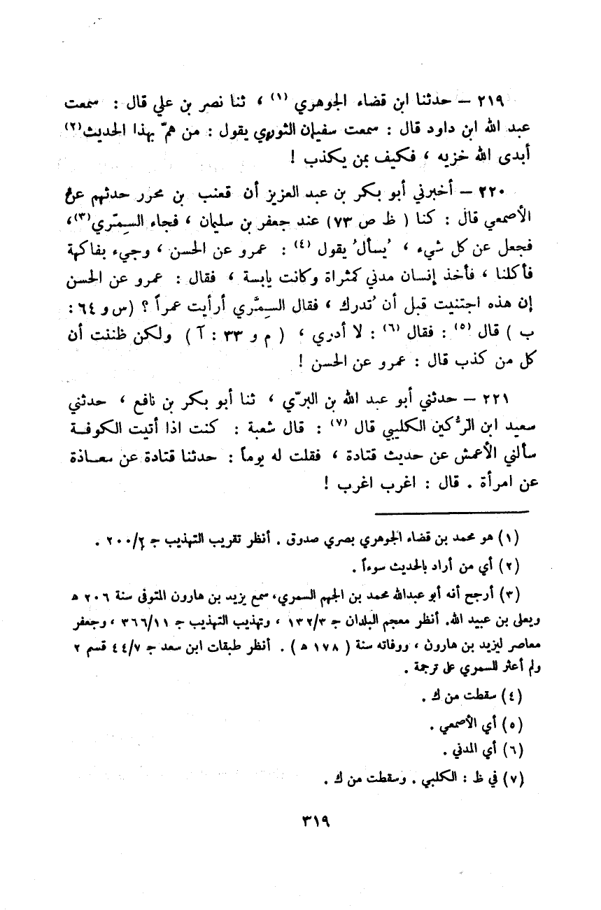 حَدَّثَنَا ابْنُ قَضَاءٍ الْجَوْهَرِيُّ، ثَنَا نَصْرُ بْنُ عَلِيٍّ قَالَ: سَمِعْتُ عَبْدَ اللَّهِ بْنَ دَاوُدَ قَالَ: سَمِعْتُ سُفْيَانَ الثَّوْرِيَّ يَقُولُ: «§مَنْ هَمَّ بِهَذَا الْحَدِيثِ أَبْدَى اللَّهُ خِزْيَهُ فَكَيْفَ بِمَنْ يَكْذِبْ»