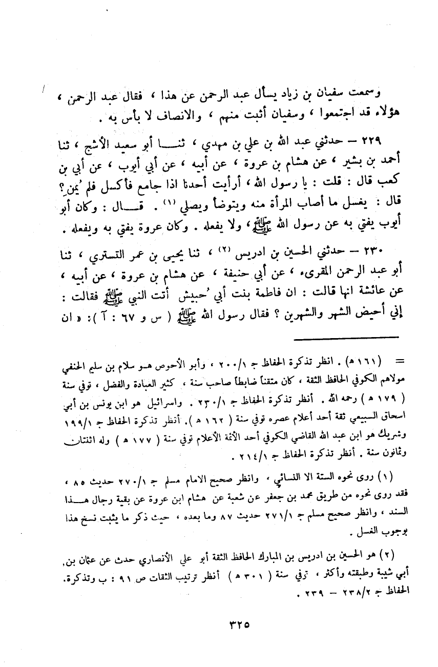 حَدَّثَنِي الْحُسَيْنُ بْنُ إِدْرِيسَ، ثَنَا يَحْيَى بْنُ عُمَرَ التُّسْتَرِيُّ، ثَنَا أَبُو عَبْدِ الرَّحْمَنِ الْمُقْرِئُ، عَنْ أَبِي حَنِيفَةَ، عَنْ هِشَامِ بْنِ عُرْوَةَ عَنْ أَبِيهِ، عَنْ عَائِشَةَ أَنَّهَا قَالَتْ: إِنَّ فَاطِمَةَ بِنْتَ أَبِي حُبَيْشٍ، أَتَتِ النَّبِيَّ صَلَّى اللهُ عَلَيْهِ وَسَلَّمَ، فَقَالَتْ: إِنِّي §أَحِيضُ الشَّهْرَ وَالشَّهْرَيْنِ؟ فَقَالَ رَسُولُ اللَّهِ صَلَّى اللهُ عَلَيْهِ وَسَلَّمَ: «إِنَّ -[326]- ذَلِكَ لَيْسَ بِالْحَيْضِ، إِنَّ ذَلِكَ عِرْقٌ مِنْ دَمِكِ، فَإِذَا أَقْبَلَ الْحَيْضُ فَدَعِي الصَّلَاةَ، وَإِذَا أَدْبَرَ فَاغْتَسِلِي لِطُهْرِكِ، ثُمَّ تَوَضَّئِي لِكُلِّ صَلَاةٍ» قَالَ أَبُو عَبْدِ الرَّحْمَنِ: سَمِعْتُ أَبَا حَنِيفَةَ يَقُولُ: «لَا يَحِلُّ لِأَحَدٍ أَنْ يُفْتِيَ بِهَذَا الْحَدِيثِ فِي الْمُسْتَحَاضَةِ»