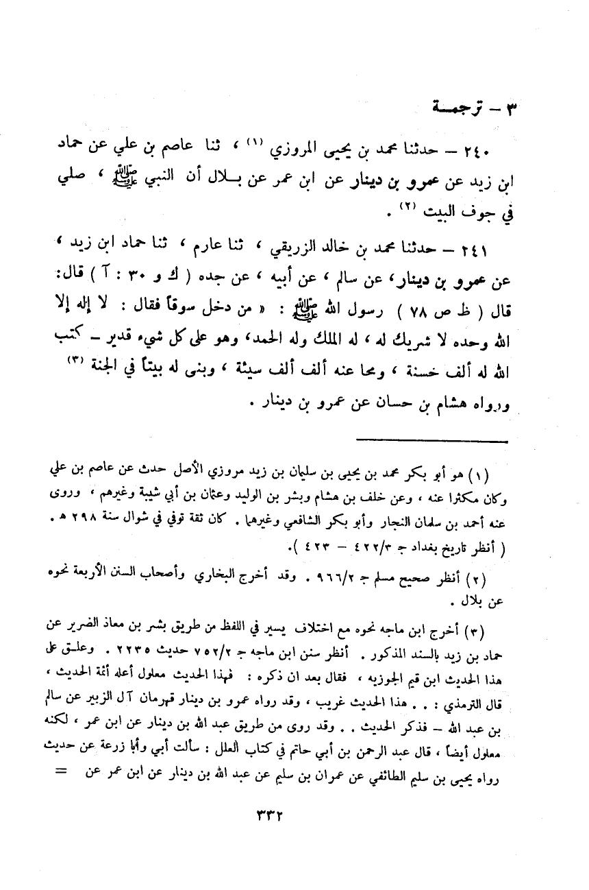 حَدَّثَنَا مُحَمَّدُ بْنُ يَحْيَى الْمَرْوَزِيُّ، ثَنَا عَاصِمُ بْنُ عَلِيٍّ، عَنْ حَمَّادِ بْنِ زَيْدٍ، عَنْ عَمْرِو بْنِ دِينَارٍ، عَنِ ابْنِ عُمَرَ، عَنْ بِلَالٍ: «أَنَّ النَّبِيَّ صَلَّى اللهُ عَلَيْهِ وَسَلَّمَ، §صَلَّى فِي جَوْفِ الْبَيْتِ»