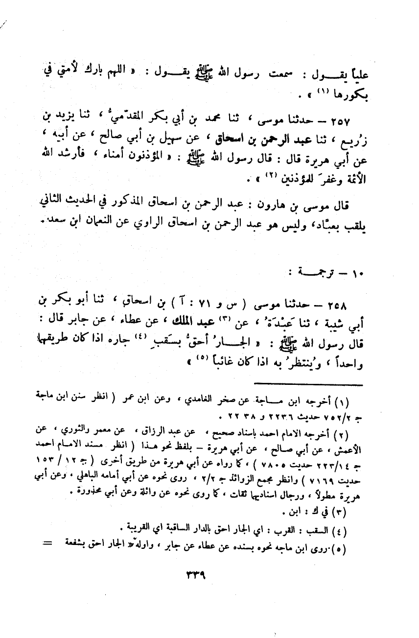 حَدَّثَنَا مُوسَى، ثَنَا مُحَمَّدُ بْنُ أَبِي بَكْرٍ الْمُقَدَّمِيُّ، ثَنَا يَزِيدُ بْنُ زُرَيْعٍ، ثَنَا عَبْدُ الرَّحْمَنِ بْنُ إِسْحَاقَ، عَنْ سُهَيْلِ بْنِ أَبِي صَالِحٍ، عَنْ أَبِيهِ، عَنْ أَبِي هُرَيْرَةَ قَالَ: قَالَ رَسُولُ اللَّهِ صَلَّى اللهُ عَلَيْهِ وَسَلَّمَ: «§الْمُؤَذِّنُونَ أُمَنَاءُ، فَأَرْشَدَ اللَّهُ الْأَئِمَّةَ، وَغَفَرَ لِلْمُؤَذِّنِينَ» قَالَ مُوسَى بْنُ هَارُونَ: عَبْدُ الرَّحْمَنِ بْنُ إِسْحَاقَ الْمَذْكُورُ فِي الْحَدِيثِ الثَّانِي يُلَقَّبُ بِعَبَّادٍ، وَلَيْسَ هُوَ عَبْدُ الرَّحْمَنِ بْنُ إِسْحَاقَ الرَّاوِي عَنِ النُّعْمَانِ بْنِ سَعْدٍ