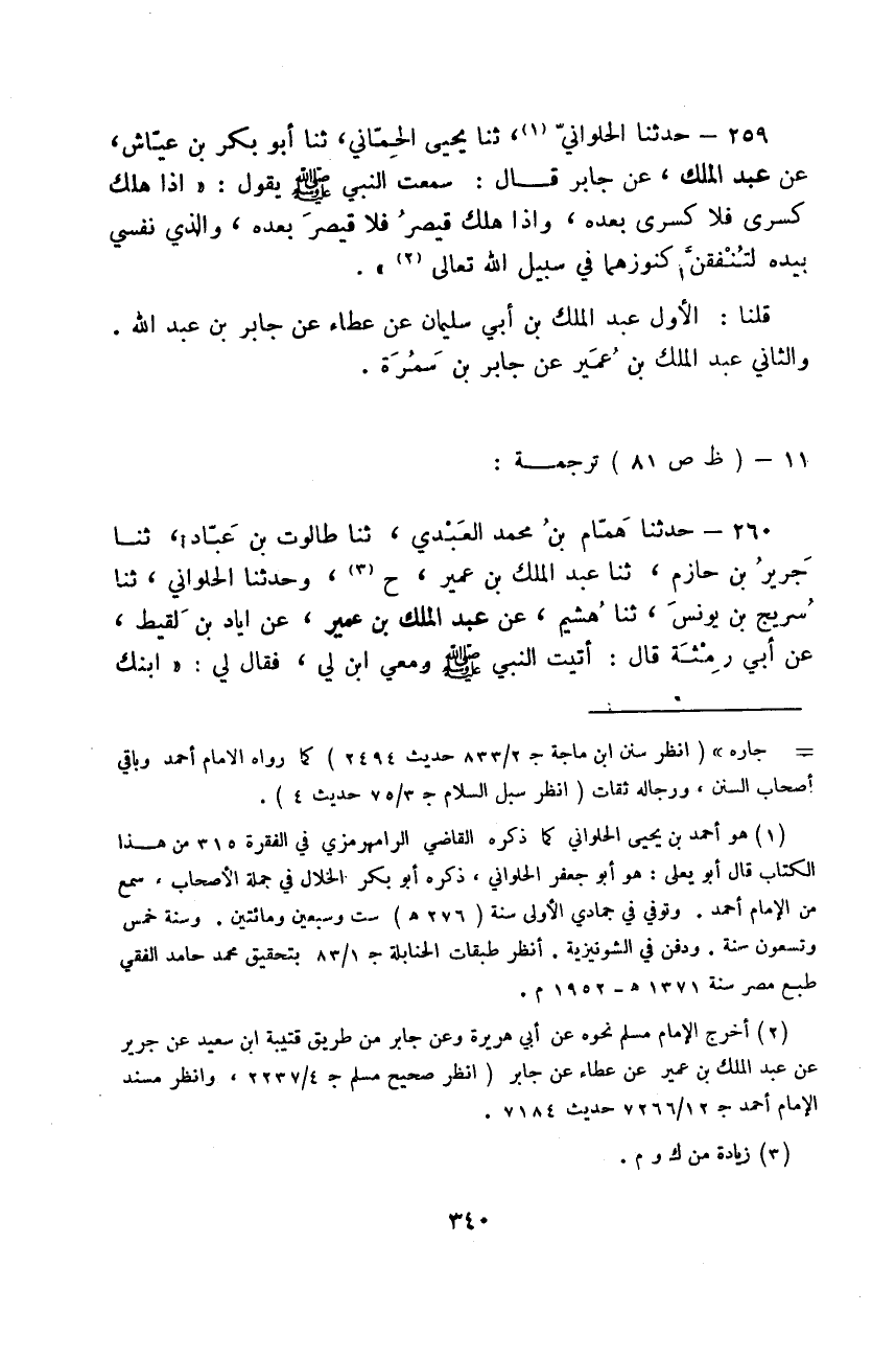 حَدَّثَنَا الْحُلْوَانِيُّ، ثَنَا يَحْيَى الْحِمَّانِيُّ، ثَنَا أَبُو بَكْرِ بْنُ عَيَّاشٍ، عَنْ عَبْدِ الْمَلِكِ، عَنْ جَابِرٍ قَالَ: سَمِعْتُ النَّبِيَّ صَلَّى اللهُ عَلَيْهِ وَسَلَّمَ يَقُولُ: «§إِذَا هَلَكَ كِسْرَى فَلَا كِسْرَى بَعْدَهُ، وَإِذَا هَلَكَ قَيْصَرُ فَلَا قَيْصَرَ بَعْدَهُ، وَالَّذِي نَفْسِي بِيَدِهِ لَتُنْفَقَنَّ كُنُوزُهُمَا فِي سَبِيلِ اللَّهِ تَعَالَى» قُلْنَا: الْأَوَّلُ عَبْدُ الْمَلِكِ بْنُ أَبِي سُلَيْمَانَ، عَنْ عَطَاءٍ، عَنْ جَابِرِ بْنِ عَبْدِ اللَّهِ، وَالثَّانِي عَبْدُ الْمَلِكِ بْنُ عُمَيْرٍ، عَنْ جَابِرِ بْنِ سَمُرَةَ