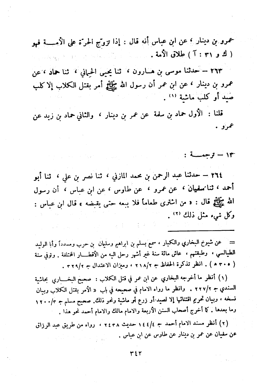 حَدَّثَنَا مُوسَى بْنُ هَارُونَ، ثَنَا يَحْيَى الْحِمَّانِيُّ، ثَنَا حَمَّادٌ، عَنْ عَمْرِو بْنِ دِينَارٍ، عَنِ ابْنِ عُمَرَ: «أَنَّ رَسُولَ اللَّهِ صَلَّى اللهُ عَلَيْهِ وَسَلَّمَ §أَمَرَ بِقَتْلِ الْكِلَابِ إِلَّا كَلْبَ صَيْدٍ أَوْ كَلْبَ مَاشِيَةٍ» قُلْنَا: الْأَوَّلُ حَمَّادُ بْنُ سَلَمَةَ، عَنْ عُمَرَ بْنِ دِينَارٍ، وَالثَّانِي حَمَّادُ بْنُ زَيْدٍ، عَنْ عَمْرٍو