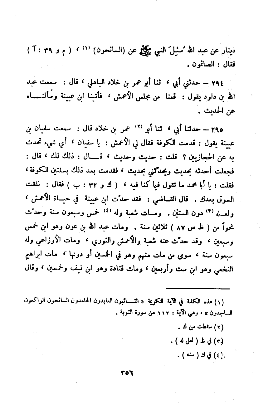 حَدَّثَنِي أَبِي، ثَنَا أَبُو عُمَرَ بْنُ خَلَّادٍ الْبَاهِلِيُّ قَالَ: سَمِعْتُ عَبْدَ اللَّهِ بْنَ دَاوُدَ يَقُولُ: «§قُمْنَا مِنْ مَجْلِسِ الْأَعْمَشِ فَأَتَيْنَا ابْنَ عُيَيْنَةَ، وَسَأَلْنَاهُ عَنِ الْحَدِيثِ»