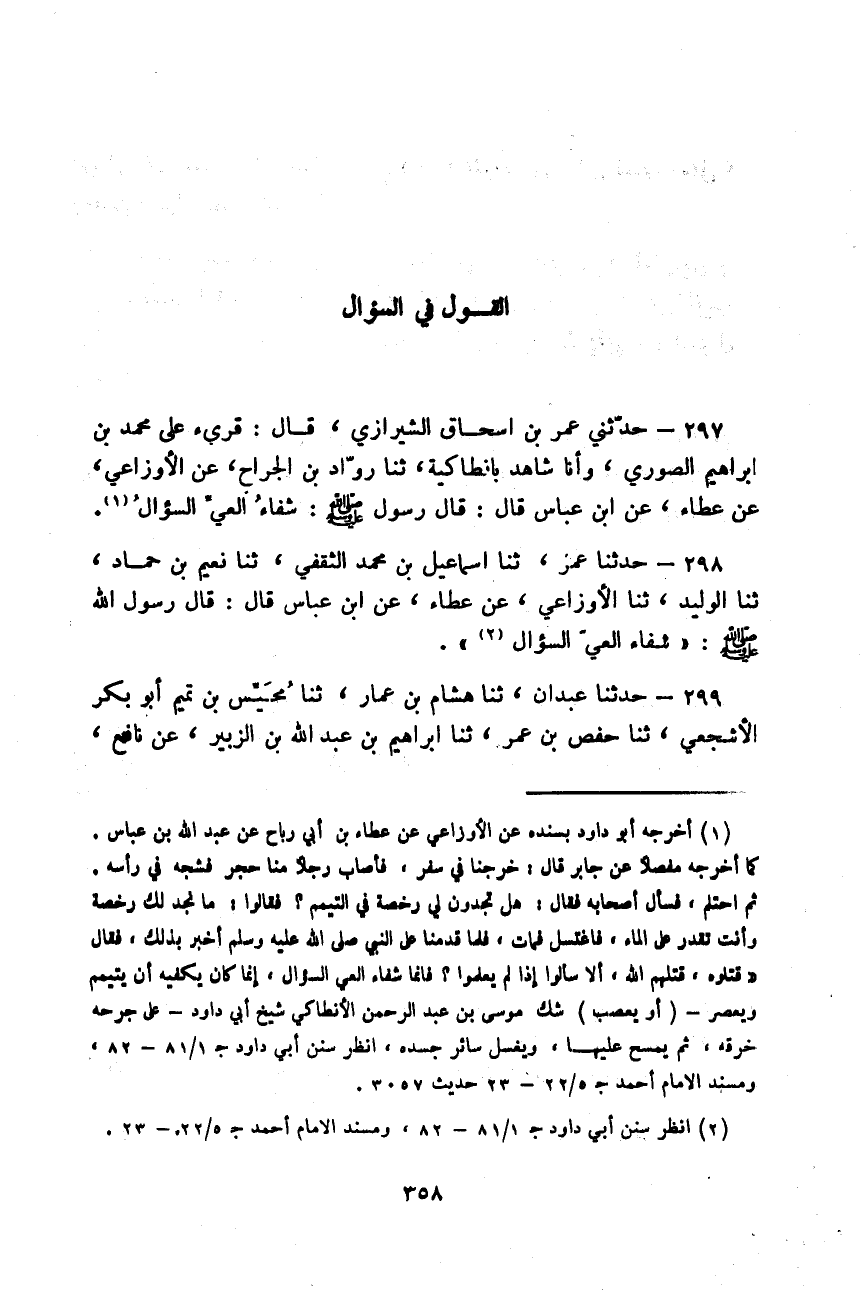 حَدَّثَنِي عُمَرُ بْنُ إِسْحَاقَ الشِّيرَازِيُّ قَالَ: قُرِئَ عَلَى مُحَمَّدِ بْنِ إِبْرَاهِيمَ الصُّورِيُّ، وَأَنَا شَاهِدٌ، بِإِنْطَاكَيَةَ، ثَنَا رَوَّادُ بْنُ الْجَرَّاحِ، عَنِ الْأَوْزَاعِيِّ، عَنْ عَطَاءٍ، عَنِ ابْنِ عَبَّاسٍ قَالَ: قَالَ رَسُولُ اللَّهِ صَلَّى اللهُ عَلَيْهِ وَسَلَّمَ: «§شِفَاءُ الْعِيِّ السُّؤَالُ»