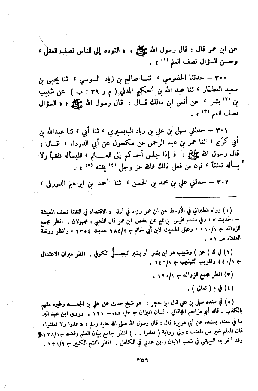 حَدَّثَنَا الْحَضْرَمِيُّ، ثَنَا صَالِحُ بْنُ زِيَادٍ السُّوسِيُّ، ثَنَا يَحْيَى بْنُ سَعِيدٍ الْعَطَّارُ، ثَنَا عَبْدُ اللَّهِ بْنُ حَكِيمٍ الْمَدَنِيُّ، عَنْ شَبِيبِ بْنِ بِشْرٍ، عَنْ أَنَسِ بْنِ مَالِكٍ قَالَ: قَالَ رَسُولُ اللَّهِ صَلَّى اللهُ عَلَيْهِ وَسَلَّمَ: «§السُّؤَالُ نِصْفُ الْعِلْمِ»