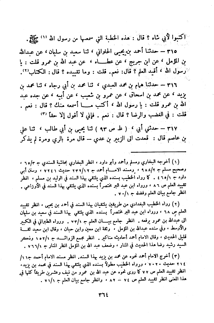 حَدَّثَنَا أَحْمَدُ بْنُ يَحْيَى الْحُلْوَانِيُّ، ثَنَا سَعِيدُ بْنُ سُلَيْمَانَ، عَنْ عَبْدِ اللَّهِ بْنِ الْمُؤَمَّلِ، عَنِ ابْنِ جُرَيْجٍ، عَنْ عَطَاءٍ عَنْ عَبْدِ اللَّهِ بْنِ عَمْرٍو قُلْتُ: يَا رَسُولَ اللَّهِ §أُقَيِّدُ الْعِلْمَ؟ قَالَ: «نَعَمْ» ، قُلْتُ: وَمَا تَقْيِيدُهُ؟ قَالَ: «الْكِتَابُ»
