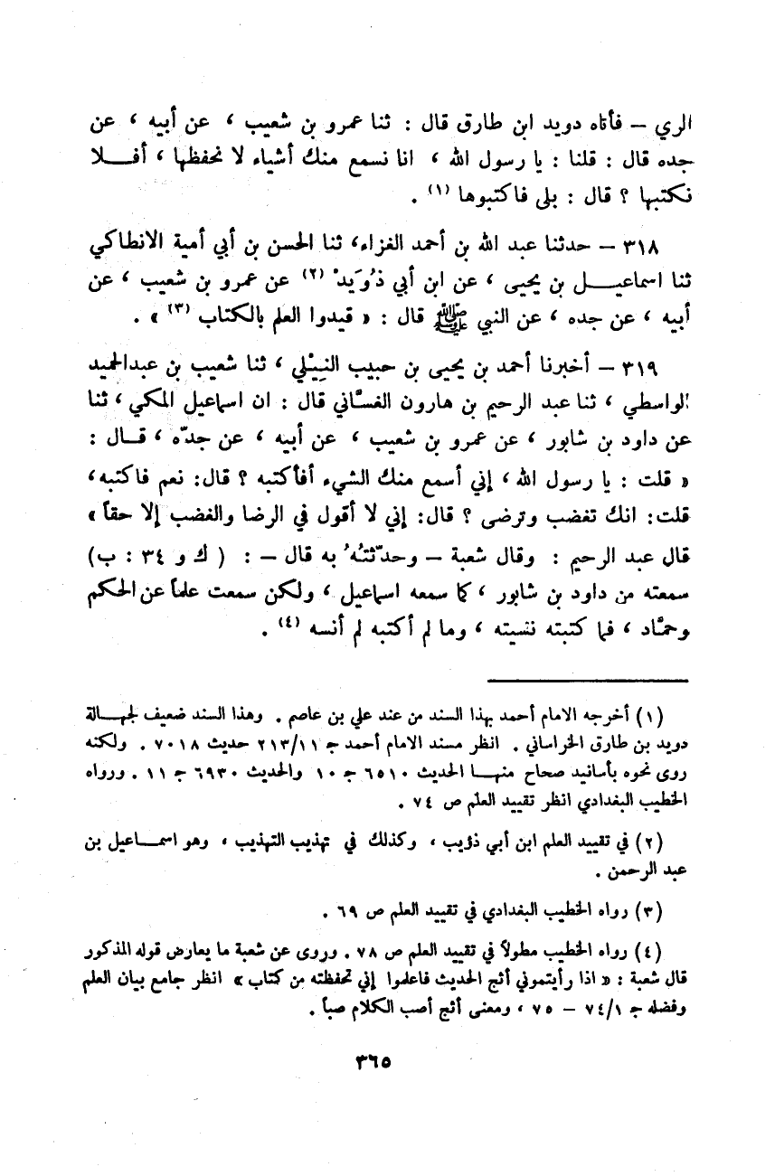 حَدَّثَنَا عَبْدُ اللَّهِ بْنُ أَحْمَدَ الْغَزَّاءُ، ثَنَا الْحَسَنُ بْنُ أبي أُمَيَّةَ الْأَنْطَاكِيُّ، ثَنَا إِسْمَاعِيلُ بْنُ يَحْيَى، عَنِ ابْنِ أَبِي ذُوَيْدٍ، عَنْ عَمْرِو بْنِ شُعَيْبٍ، عَنْ أَبِيهِ، عَنْ جَدِّهِ عَنِ النَّبِيِّ صَلَّى اللهُ عَلَيْهِ وَسَلَّمَ قَالَ: «§قَيِّدُوا الْعِلْمَ بِالْكِتَابِ»