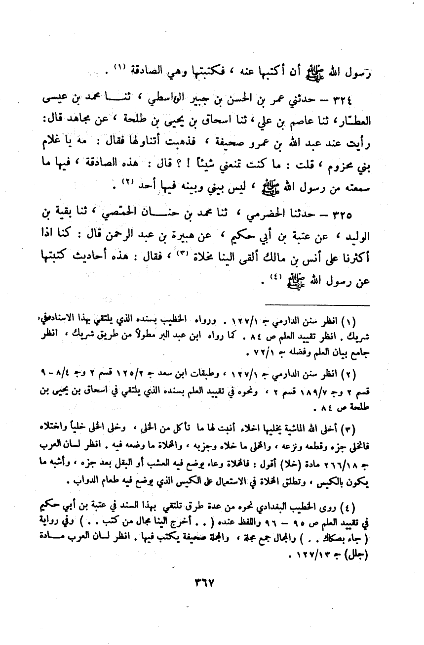 حَدَّثَنِي عُمَرُ بْنُ الْحَسَنِ بْنِ جُبَيْرٍ الْوَاسِطِيُّ، ثَنَا مُحَمَّدُ بْنُ عِيسَى الْعَطَّارُ، ثَنَا عَاصِمُ بْنُ عَلِيٍّ، ثَنَا إِسْحَاقُ بْنُ يَحْيَى بْنِ طَلْحَةَ، عَنْ مُجَاهِدٍ قَالَ: رَأَيْتُ عِنْدَ عَبْدِ اللَّهِ بْنِ عَمْرٍو صَحِيفَةً، فَذَهَبْتُ أَتَنَاوَلُهَا فَقَالَ: " مَهْ يَا غُلَامَ بَنِي مَحْزُومٍ قُلْتُ: مَا كُنْتُ تَمْنَعُنِي شَيْئًا قَالَ: هَذِهِ §الصَّادِقَةُ، فِيهَا مَا سَمِعْتُهُ مِنْ رَسُولِ اللَّهِ صَلَّى اللهُ عَلَيْهِ وَسَلَّمَ، لَيْسَ بَيْنِي وَبَيْنَهُ فِيهَا أَحَدٌ "