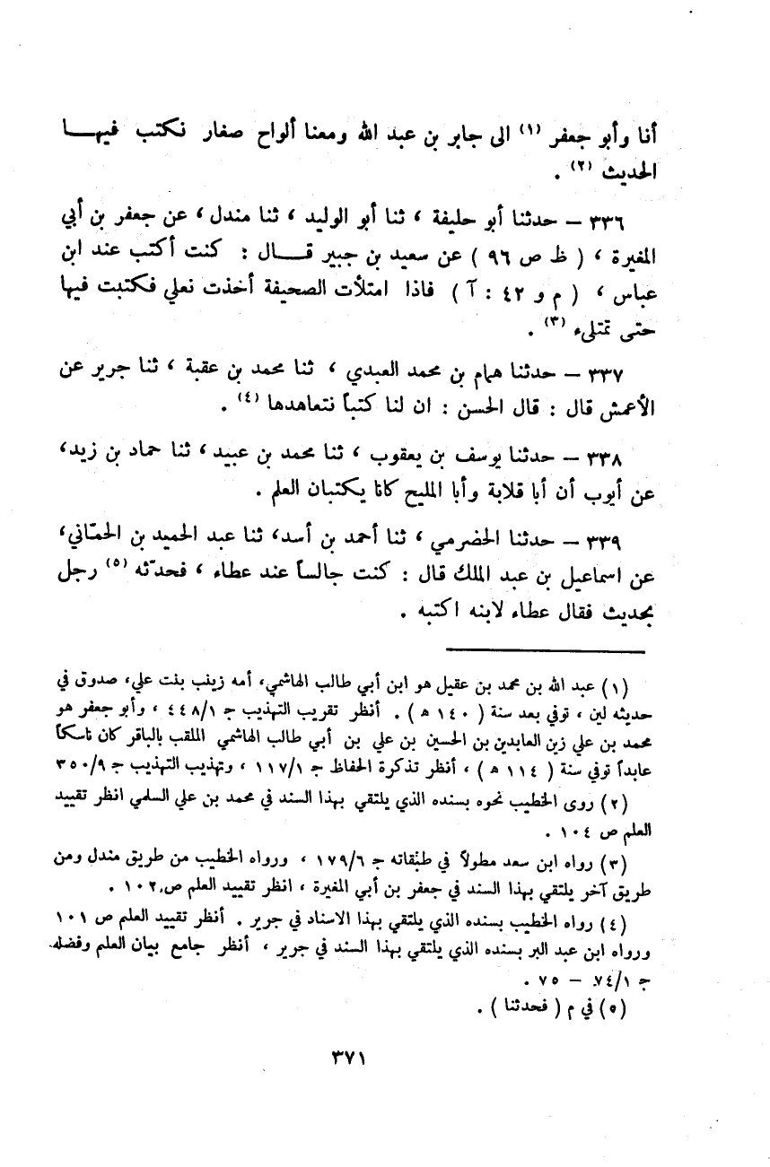 حَدَّثَنَا أَبُو خَلِيفَةَ، ثَنَا أَبُو الْوَلِيدِ، ثَنَا مِنْدَلٌ، عَنْ جَعْفَرِ بْنِ أَبِي الْمُغِيرَةِ، عَنْ سَعِيدِ بْنِ جُبَيْرٍ قَالَ: «كُنْتُ أَكْتُبُ عِنْدَ ابْنِ عَبَّاسٍ، §فَإِذَا امْتَلَأَتِ الصَّحِيفَةُ أَخَذْتُ نَعْلِي فَكَتَبْتُ فِيهَا حَتَّى تَمْتَلِئَ»