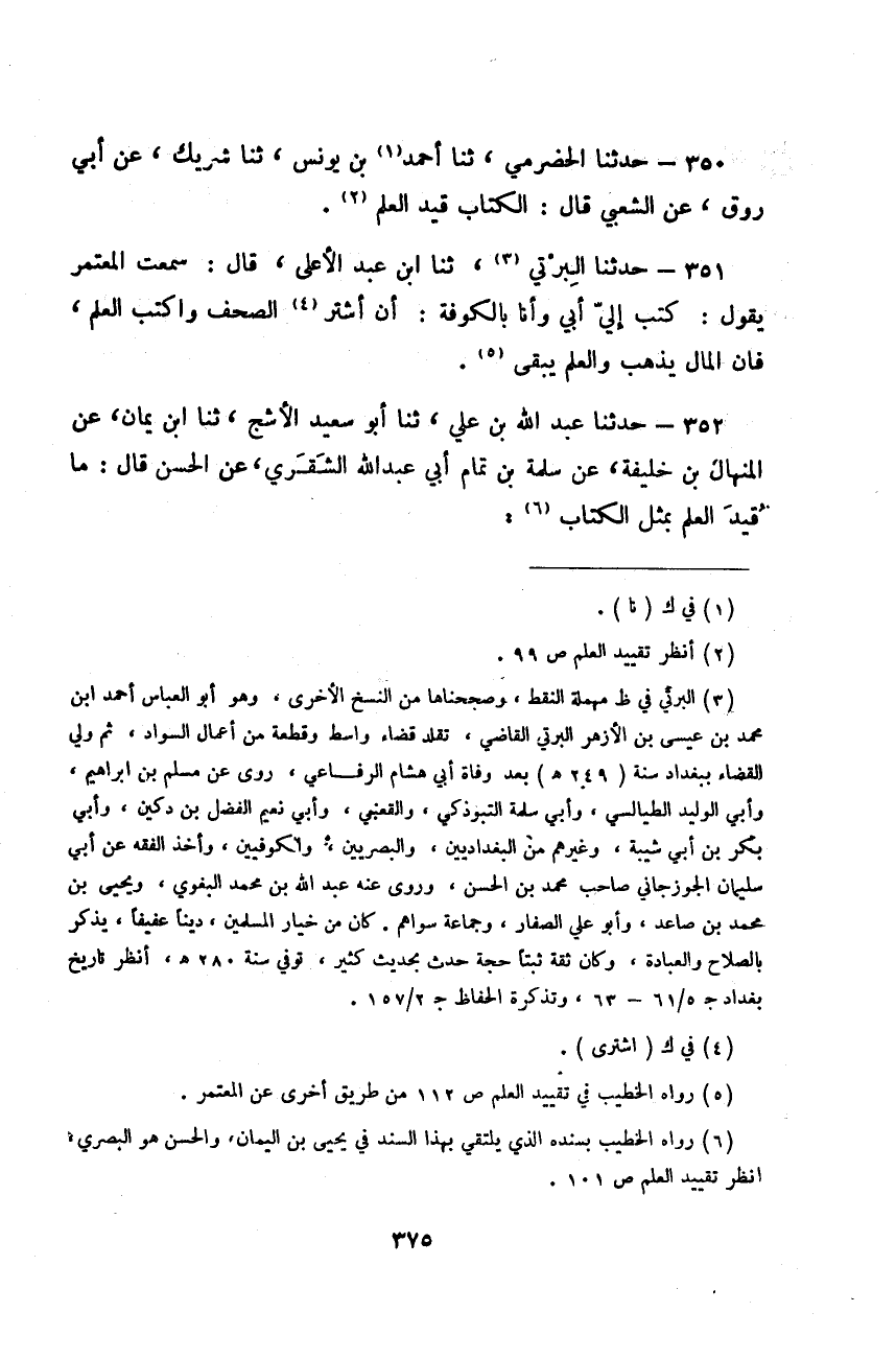 حَدَّثَنَا الْبِرْتِيُّ، ثَنَا ابْنُ عَبْدِ الْأَعْلَى قَالَ: سَمِعْتُ الْمُعْتَمِرَ يَقُولُ: " كَتَبَ إِلَيَّ أَبِي وَأَنَا بِالْكُوفَةِ: أَنْ §أَشْتَرِ الصُّحُفَ، وَأَكْتُبُ الْعِلْمَ، فَإِنَّ الْمَالَ يَذْهَبُ وَالْعِلْمَ يَبْقَى "