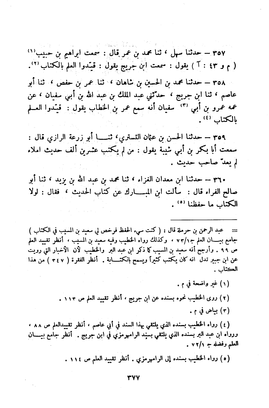حَدَّثَنَا سَهْلٌ، ثَنَا مُحَمَّدُ بْنُ عُمَرَ قَالَ: سَمِعْتُ إِبْرَاهِيمَ بْنَ حَبِيبٍ يَقُولُ: سَمِعْتُ ابْنَ جُرَيْجٍ يَقُولُ: «§قَيِّدُوا الْعِلْمَ بِالْكِتَابِ»