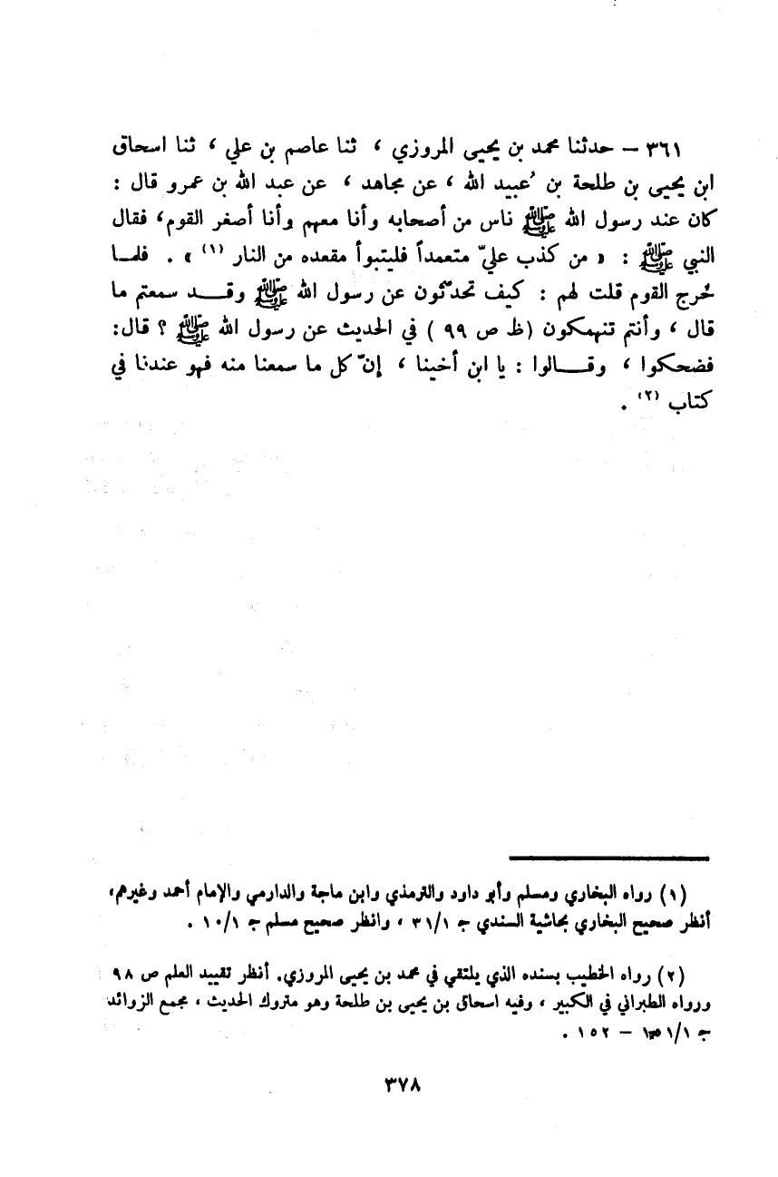 حَدَّثَنَا مُحَمَّدُ بْنُ يَحْيَى الْمَرْوَزِيُّ، ثَنَا عَاصِمُ بْنُ عَلِيٍّ، ثَنَا إِسْحَاقُ بْنُ يَحْيَى بْنِ طَلْحَةَ بْنِ عُبَيْدِ اللَّهِ، عَنْ مُجَاهِدٍ، عَنْ عَبْدِ اللَّهِ بْنِ عَمْرٍو قَالَ: كَانَ عِنْدَ رَسُولِ اللَّهِ صَلَّى اللهُ عَلَيْهِ وَسَلَّمَ نَاسٌ مِنْ أَصْحَابِهِ وَأَنَا مَعَهُمْ وَأَنَا أَصْغَرُ الْقَوْمِ، فَقَالَ النَّبِيُّ صَلَّى اللهُ عَلَيْهِ وَسَلَّمَ: «§مَنْ كَذَبَ عَلَيَّ مُتَعَمِّدًا فَلْيَتَبَوَّأْ مَقْعَدَهُ مِنَ النَّارِ» فَلَمَّا خَرَجَ الْقَوْمُ قُلْتُ لَهُمْ: كَيْفَ تُحَدِّثُونَ عَنْ رَسُولِ اللَّهِ صَلَّى اللهُ عَلَيْهِ وَسَلَّمَ وَقَدْ سَمِعْتُمْ مَا قَالَ، وَأَنْتُمْ تَنْهَمِكُونَ فِي الْحَدِيثِ عَنْ رَسُولِ اللَّهِ صَلَّى اللهُ عَلَيْهِ وَسَلَّمَ؟ قَالَ: فَضَحِكُوا، وَقَالُوا: يَا ابْنَ أَخِينَا، إِنَّ كُلَّ مَا سَمِعْنَا مِنْهُ فَهُوَ عِنْدَنَا فِي كِتَابٍ