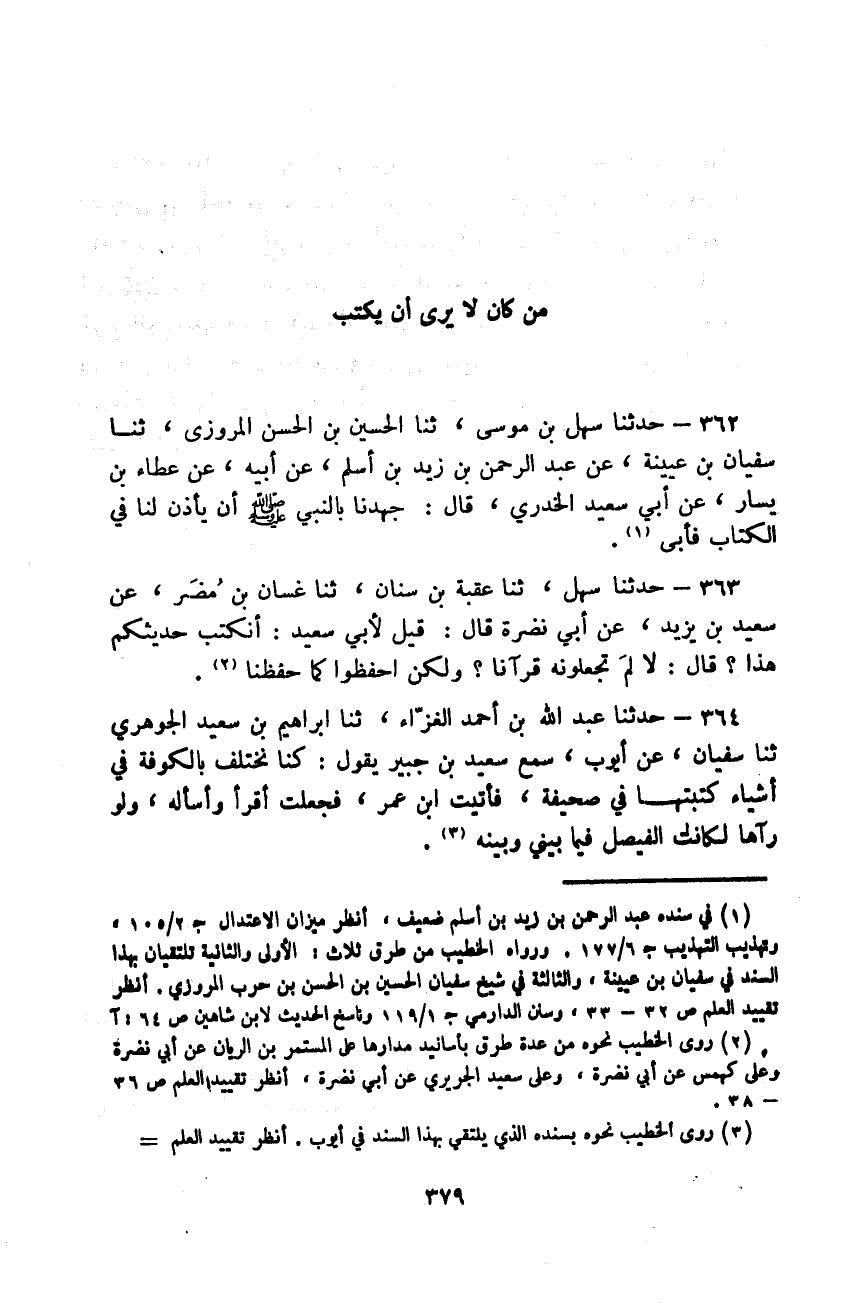 حَدَّثَنَا سَهْلُ بْنُ مُوسَى، ثَنَا الْحُسَيْنُ بْنُ الْحَسَنِ الْمَرْوَزِيُّ، ثَنَا سُفْيَانُ بْنُ عُيَيْنَةَ، عَنْ عَبْدِ الرَّحْمَنِ بْنِ زَيْدِ بْنِ أَسْلَمَ، عَنْ أَبِيهِ، عَنْ عَطَاءِ بْنِ يَسَارٍ، عَنْ أَبِي سَعِيدٍ الْخُدْرِيِّ قَالَ: «§جَهَدْنَا بِالنَّبِيِّ صَلَّى اللهُ عَلَيْهِ وَسَلَّمَ أَنْ يَأْذَنَ لَنَا فِي الْكِتَابِ فَأَبَى»