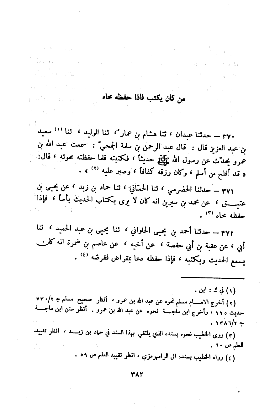 حَدَّثَنَا الْحَضْرَمِيُّ، ثَنَا الْحِمَّانِيُّ، ثَنَا حَمَّادُ بْنُ زَيْدٍ، عَنْ يَحْيَى بْنِ عَتِيقٍ، عَنْ مُحَمَّدِ بْنِ سِيرِينَ: «أَنَّهُ كَانَ §لَا يَرَى بِكِتَابِ الْحَدِيثِ بَأْسًا، فَإِذَا حَفِظَهُ مَحَاهُ»