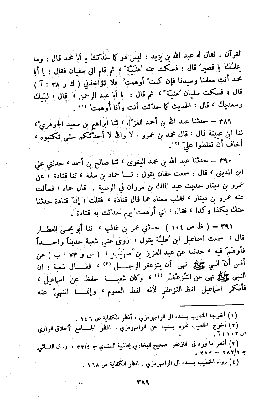 حَدَّثَنَا عَبْدُ اللَّهِ بْنُ أَحْمَدَ الْغَزَّاءُ، ثَنَا إِبْرَاهِيمُ بْنُ سَعِيدٍ الْجَوْهَرِيُّ، ثَنَا ابْنُ عُيَيْنَةَ قَالَ: قَالَ مُحَمَّدُ بْنُ عَمْرٍو: «لَا وَاللَّهِ، §لَا أُحَدِّثُكُمُ حَتَّى تَكْتُبُوهُ أَخَافُ أَنْ تَغْلَطُوا عَلَيَّ»