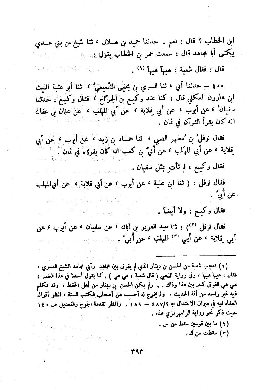 حَدَّثَنَا أَبِي، ثَنَا السَّرِيُّ بْنُ يَحْيَى التَّمِيمِيُّ، ثَنَا أَبُو عُتْبَةَ اللَّيْثُ بْنُ هَارُونَ الْعُكْلِيُّ، قَالَ: كُنَّا عِنْدَ وَكِيعِ بْنِ الْجَرَّاحِ، فَقَالَ وَكِيعٌ: حَدَّثَنَا السَّرِيُّ بْنُ يَحْيَى التَّمِيمِيُّ، حَدَّثَنَا أَبُو عُتْبَةَ اللَّيْثُ بْنُ هَارُونَ الْعُكْلِيُّ، قَالَ: كُنَّا عِنْدَ وَكِيعِ بْنِ الْجَرَّاحِ، فَقَالَ وَكِيعٌ: حَدَّثَنَا سُفْيَانُ، عَنْ أَيُّوبَ، عَنْ أَبِي قِلَابَةَ، عَنْ أَبِي الْمُهَلَّبِ، عَنْ عُثْمَانَ بْنِ عَفَّانَ: «أَنَّهُ كَانَ §يَقْرَأُ الْقُرْآنَ فِي ثَمَانٍ» فَقَالَ نَوْفَلُ بْنُ مُطَهَّرٍ الضَّبِّيُّ، حَدَّثَنَا حَمَّادُ بْنُ زَيْدٍ، عَنْ أَيُّوبَ، عَنْ أَبِي قِلَابَةَ، عَنْ أَبِي الْمُهَلَّبِ، عَنْ أُبَيِّ بْنِ كَعْبٍ أَنَّهُ كَانَ يَقْرَؤُهُ فِي ثَمَانٍ فَقَالَ وَكِيعٌ: لَمْ تَأْتِ بِمِثْلِ سُفْيَانَ فَقَالَ نَوْفَلٌ: حَدَّثَنَا ابْنُ عُلَيَّةَ، عَنْ أَيُّوبَ، عَنْ أَبِي قِلَابَةَ، عَنْ أَبِي الْمُهَلَّبِ، عَنْ أُبَيِّ فَقَالَ وَكِيعٌ: وَلَا أَيْضًا فَقَالَ نَوْفَلٌ: حَدَّثَنَا عَبْدُ الْعَزِيزِ بْنُ أَبَانَ، عَنْ سُفْيَانَ، عَنْ أَيُّوبَ، عَنْ أَبِي قِلَابَةَ، عَنْ أَبِي الْمُهَلَّبِ، عَنْ أُبَيِّ
