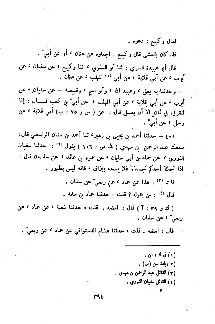فَقَالَ وَكِيعٌ: دَعُوهُ فَلَمَّا كَانَ بِالْعَشِيِّ، قَالَ وَكِيعٌ: اجْعَلُوهُ عَنْ عُثْمَانَ، أَوْ عَنْ أُبَيِّ قَالَ أَبُو عُبَيْدَةَ السَّرِيُّ: حَدَّثَنَا أَبُو السَّرِيِّ، حَدَّثَنَا وَكِيعٌ، عَنْ سُفْيَانَ، عَنْ أَيُّوبَ، عَنْ أَبِي قِلَابَةَ، عَنْ أَبِي الْمُهَلَّبِ، عَنْ عُثْمَانَ