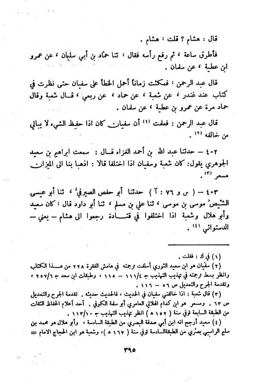قَالَ: هِشَامٌ؟ قُلْتُ: هِشَامٌ فَأَطْرَقَ سَاعَةً، ثُمَّ رَفَعَ رَأْسَهُ، فَقَالَ: ثَنَا حَمَّادُ بْنُ أَبِي سُلَيْمَانَ، عَنْ عَمْرِو بْنِ عَطِيَّةَ، عَنْ سَلْمَانَ قَالَ عَبْدُ الرَّحْمَنِ، فَمَكَثْتُ زَمَانًا أَحْمِلُ الْخَطَأَ عَلَى سُفْيَانَ حَتَّى نَظَرْتُ فِي كِتَابٍ عِنْدَ غُنْدَرٍ، عَنْ شُعْبَةَ، عَنْ حَمَّادٍ، عَنْ رِبْعِيٍّ، قَالَ شُعْبَةُ وَقَالَ حَمَّادٌ مَرَّةً: عَنْ عَمْرِو بْنِ عَطِيَّةَ، عَنْ سَلْمَانَ قَالَ عَبْدُ الرَّحْمَنِ، فَعَلِمْتُ أَنَّ سُفْيَانَ كَانَ إِذَا حَفِظَ الشَّيْءَ لَا يُبَالِي مَنْ خَالَفَهُ