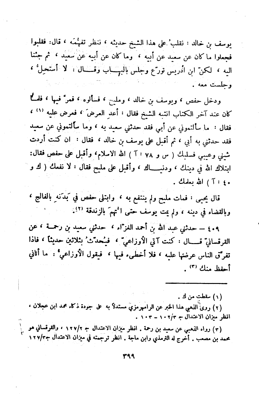 يُوسُفُ بْنُ خَالِدٍ: §نَقْلِبُ عَلَى هَذَا الشَّيْخِ حَدِيثَهُ، نَنْظُرُ تَفَهُّمَهُ قَالَ: فَقَلَبُوا فَجَعَلُوا مَا كَانَ عَنْ سَعِيدٍ، عَنْ أَبِيهِ؛ وَمَا كَانَ عَنْ أَبِيهِ، عَنْ سَعِيدٍ، ثُمَّ جِئْنَا إِلَيْهِ، لَكِنَّ ابْنَ إِدْرِيسَ تَوَرَّعَ وَجَلَسَ بِالْبَابِ وَقَالَ: لَا أَسْتَحِلُّ وَجَلَسْتُ مَعَهُ وَدَخَلَ حَفْصٌ، وَيُوسُفُ بْنُ خَالِدٍ، وَمَلِيحٌ، فَسَأَلُوهُ، فَمَرَّ فِيهَا، فَلَمَّا كَانَ عِنْدَ آخِرِ الْكِتَابِ انْتَبَهَ الشَّيْخُ، فَقَالَ: أَعِدِ الْعَرْضَ، فَعَرَضَ عَلَيْهِ، فَقَالَ: مَا سَأَلْتُمُونِي عَنْ أَبِي فَقَدْ حَدَّثَنِي سَعِيدٌ بِهِ، وَمَا سَأَلْتُمُونِي عَنْ سَعِيدٍ فَقَدْ حَدَّثَنِي بِهِ أَبِي، ثُمَّ أَقْبَلَ عَلَى يُوسُفَ بْنِ خَالِدٍ فَقَالَ: إِنْ كُنْتَ أَرَدْتَ شَيْنِي وَعَيْبِي فَسَلَبَكَ اللَّهُ الْإِسْلَامَ، وَأَقْبَلَ عَلَى حَفْصٍ فَقَالَ: ابْتَلَاكَ اللَّهُ فِي دِينِكَ، وَدُنْيَاكَ، وَأَقْبَلَ عَلَى مَلِيحٍ فَقَالَ: لَا نَفَعَكَ اللَّهُ بِعِلْمِكَ قَالَ يَحْيَى: فَمَاتَ مَلِيحٌ، وَلَمْ يَنْتَفِعْ بِهِ، وَابْتُلُيَ حَفْصٌ فِي بَدَنِهِ بِالْفَالِجِ، وَبِالْقَضَاءِ فِي دِينِهِ، وَلَمْ يَمُتْ يُوسُفُ حَتَّى اتُّهِمَ بِالزَّنْدَقَةِ "