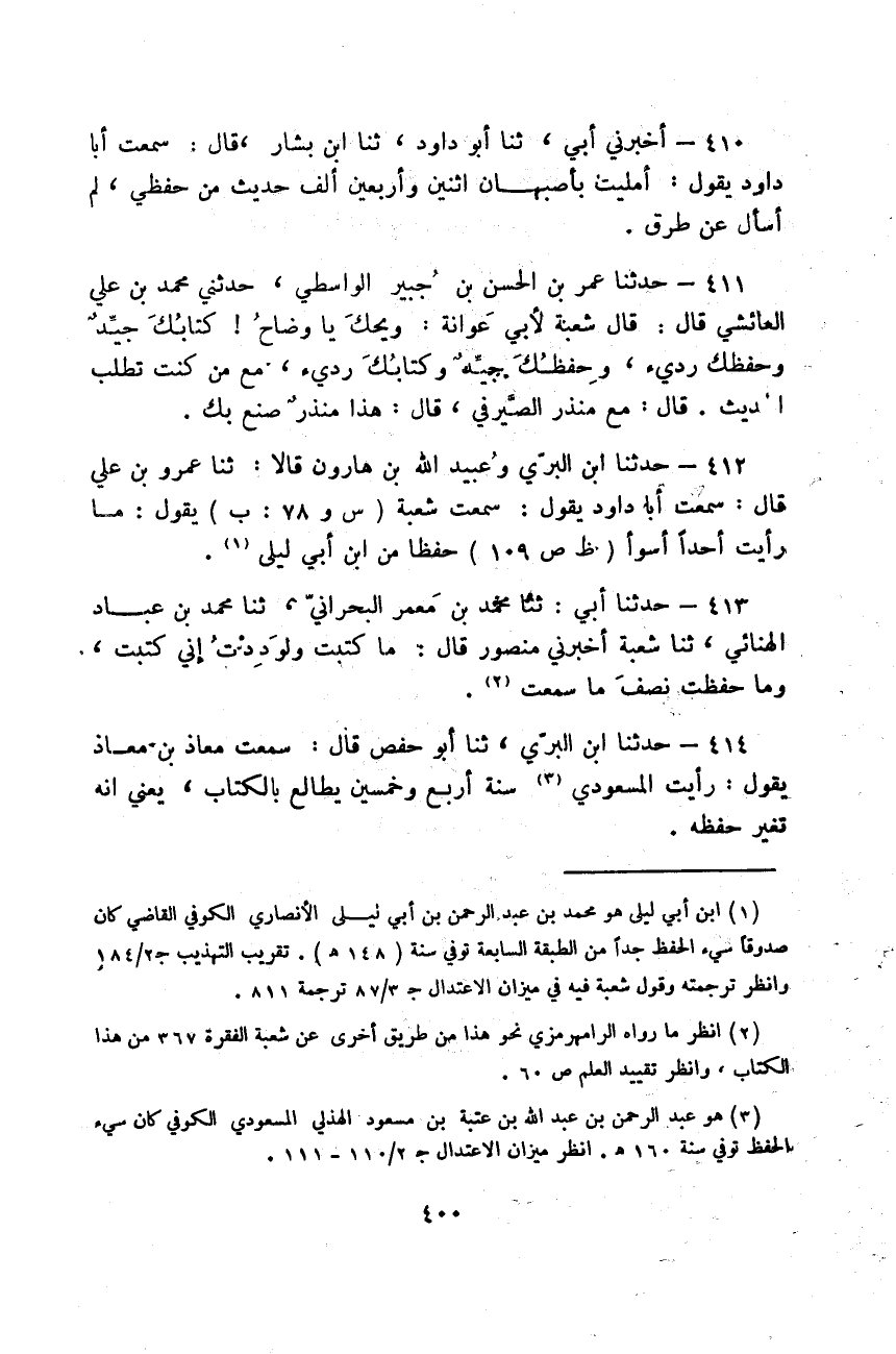 حَدَّثَنَا ابْنُ الْبُرِّيِّ، وَعُبَيْدُ اللَّهِ بْنُ هَارُونَ قَالَا: ثَنَا عَمْرُو بْنُ عَلِيٍّ قَالَ: سَمِعْتُ أَبَا دَاوُدَ يَقُولُ: سَمِعْتُ شُعْبَةَ يَقُولُ: «§مَا رَأَيْتُ أَحَدًا أَسْوَأَ حِفْظًا مِنِ ابْنِ أَبِي لَيْلَى»