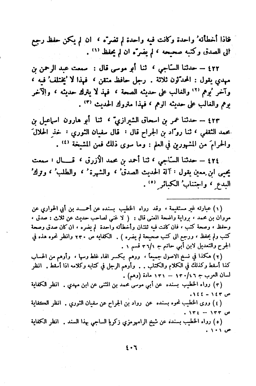 حَدَّثَنَا السَّاجِيُّ، ثَنَا أَبُو مُوسَى قَالَ: سَمِعْتُ عَبْدَ الرَّحْمَنِ بْنَ مَهْدِيٍّ يَقُولُ: «§الْمُحَدِّثُونَ ثَلَاثَةٌ؛ رَجُلٌ حَافَظٌ مُتْقِنٌ، فَهَذَا لَا يَخْتَلِفُ فِيهِ، وَآخَرُ يُوهِمُ وَالْغَالِبُ عَلَى حَدِيثِهِ الصِّحَّةُ، فَهَذَا لَا يُتْرَكُ حَدِيثُهُ، وَالْآخَرُ يُوهِمُ وَالْغَالِبُ عَلَى حَدِيثِهِ الْوَهْمُ، فَهَذَا مَتْرُوكُ الْحَدِيثِ»