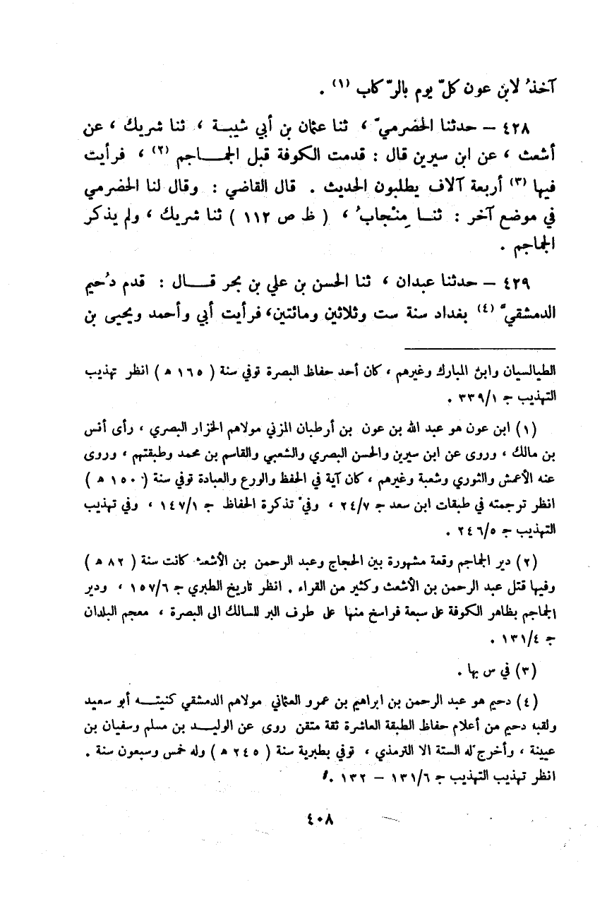 حَدَّثَنَا الْحَضْرَمِيُّ، ثَنَا عُثْمَانُ بْنُ أَبِي شَيْبَةَ، ثَنَا شَرِيكٌ، عَنْ أَشْعَثَ، عَنِ ابْنِ سِيرِينَ قَالَ: «قَدِمْتُ الْكُوفَةَ قَبْلَ الْجَمَاجِمِ §فَرَأَيْتُ فِيهَا أَرْبَعَةَ آلَافٍ يَطْلُبُونَ الْحَدِيثَ» قَالَ الْقَاضِي: وَقَالَ لَنَا الْحَضْرَمِيُّ فِي مَوْضِعٍ آخَرَ: ثَنَا مِنْجَابٌ ثَنَا شَرِيكٌ وَلَمْ يَذْكُرِ: «الْجَمَاجِمَ»