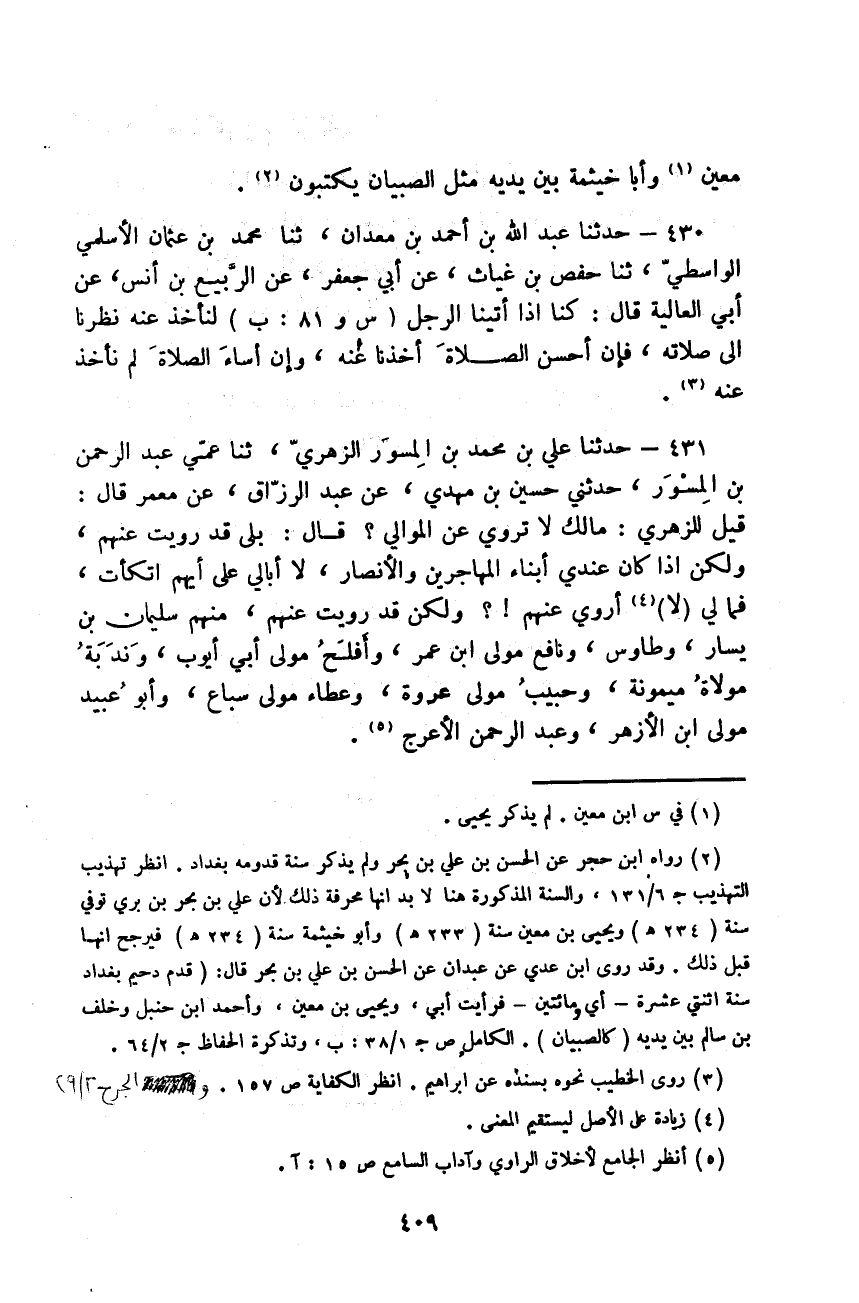 حَدَّثَنَا عَبْدُ اللَّهِ بْنُ أَحْمَدَ بْنِ مَعْدَانَ، ثَنَا مُحَمَّدُ بْنُ عُثْمَانَ الْأَسْلَمِيُّ الْوَاسِطِيُّ، ثَنَا حَفْصُ بْنُ غِيَاثٍ، عَنْ أَبِي جَعْفَرٍ، عَنِ الرَّبِيعِ بْنِ أَنَسٍ، عَنْ أَبِي الْعَالِيَةِ قَالَ: «كُنَّا §إِذَا أَتَيْنَا الرَّجُلَ لَنَأْخُذَ عَنْهُ نَظَرْنَا إِلَى صَلَاتِهِ فَإِنْ أَحْسَنَ الصَّلَاةَ أَخَذْنَا عَنْهُ، وَإِنْ أَسَاءَ الصَّلَاةَ لَمْ نَأْخُذْ عَنْهُ»