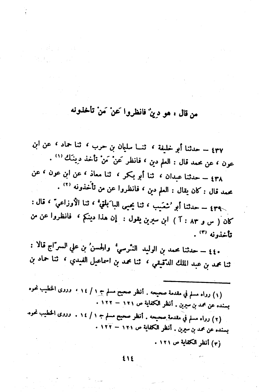 حَدَّثَنَا أَبُو خَلِيفَةَ، ثَنَا سُلَيْمَانُ بْنُ حَرْبٍ، ثَنَا حَمَّادٌ، عَنِ ابْنِ عَوْنٍ، عَنْ مُحَمَّدٍ قَالَ: «§الْعِلْمُ دِينٌ، فَانْظُرْ عَنْ مَنْ تَأْخُذْ دِينَكَ»