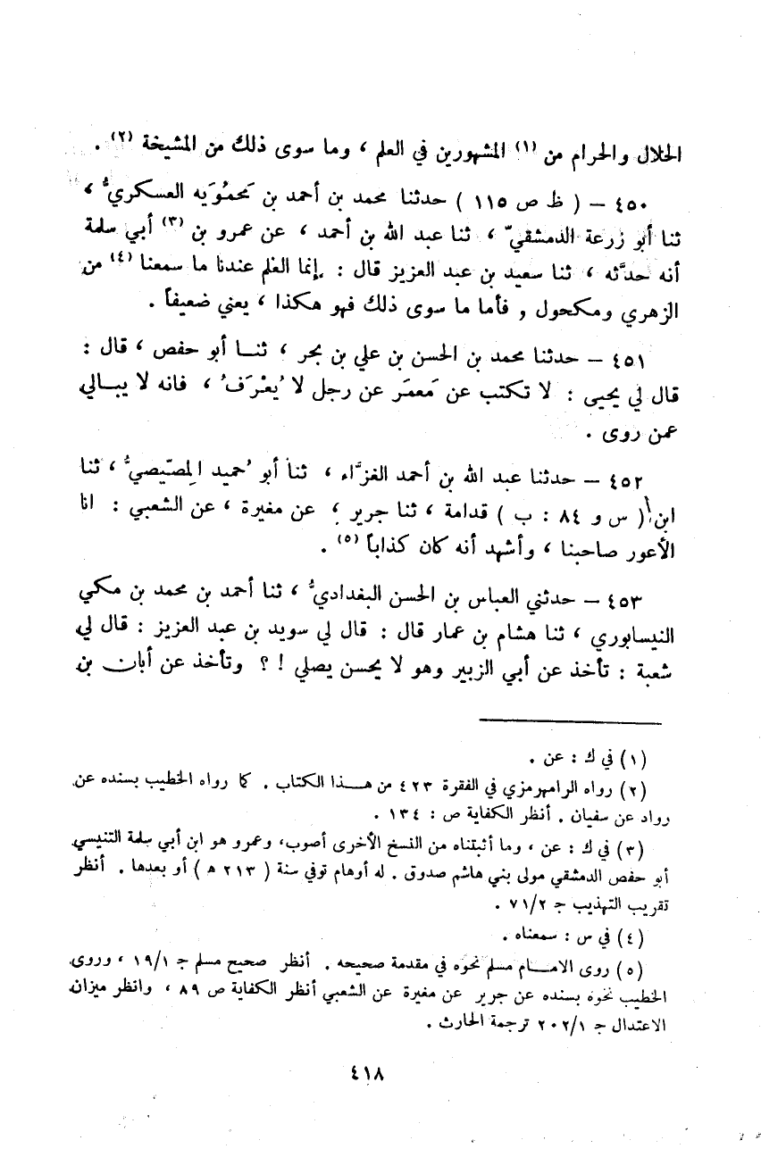 حَدَّثَنَا مُحَمَّدُ بْنُ أَحْمَدَ بْنِ مَحْمَوِيهِ الْعَسْكَرِيُّ، ثَنَا أَبُو زُرْعَةَ الدِّمَشْقِيُّ، ثَنَا عَبْدُ اللَّهِ بْنُ أَحْمَدَ، عَنْ عَمْرِو بْنِ أَبِي سَلَمَةَ، أَنَّهُ حَدَّثَهُ، ثَنَا سَعِيدُ بْنُ عَبْدِ الْعَزِيزِ قَالَ: «إِنَّمَا §الْعِلْمُ عِنْدَنَا مَا سَمِعْنَا مِنَ الزُّهْرِيِّ وَمَكْحُولٍ فَأَمَّا مَا سِوَى ذَلِكَ فَهُوَ هَكَذَا» يَعْنِي ضَعِيفًا