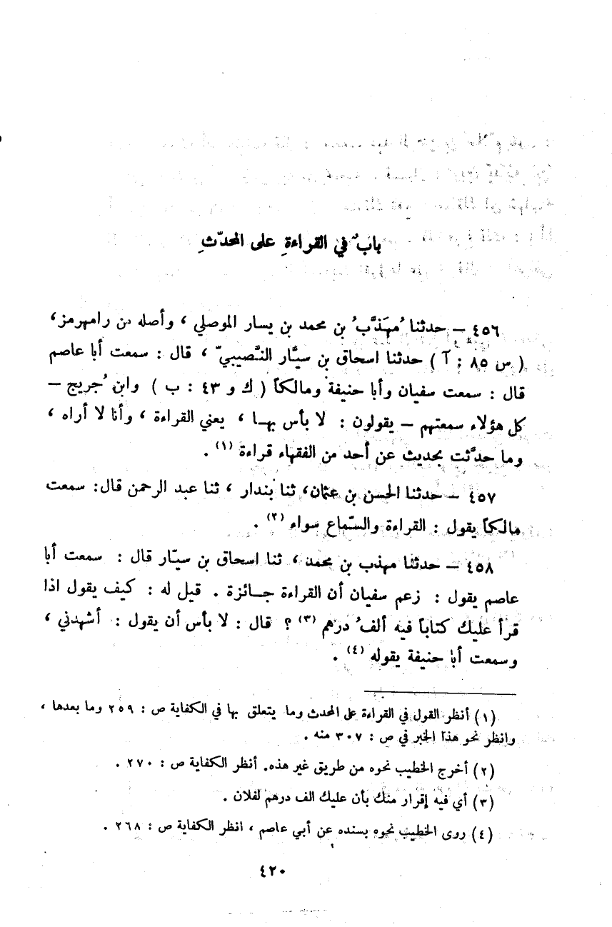 حَدَّثَنَا مُهَذَّبُ بْنُ مُحَمَّدِ بْنِ يَسَارٍ الْمَوْصِلِيُّ، وَأَصْلُهُ مِنْ رَامَهُرْمُزَ، حَدَّثَنَا إِسْحَاقُ بْنُ سَيَّارٍ النَّصِيبِيُّ، قَالَ: سَمِعْتُ أَبَا عَاصِمٍ قَالَ: سَمِعْتُ سُفْيَانَ، وَأَبَا حَنِيفَةَ وَمَالِكًا وَابْنَ جُرَيْجٍ كُلَّ هَؤُلَاءِ سَمِعْتُهُمْ يَقُولُونَ: «§لَا بَأْسَ بِهَا يَعْنِي الْقِرَاءَةَ، وَأَنَا لَا أَرَاهُ وَمَا حَدَّثْتُ بِحَدِيثٍ عَنْ أَحَدٍ مِنَ الْفُقَهَاءِ قِرَاءَةً»