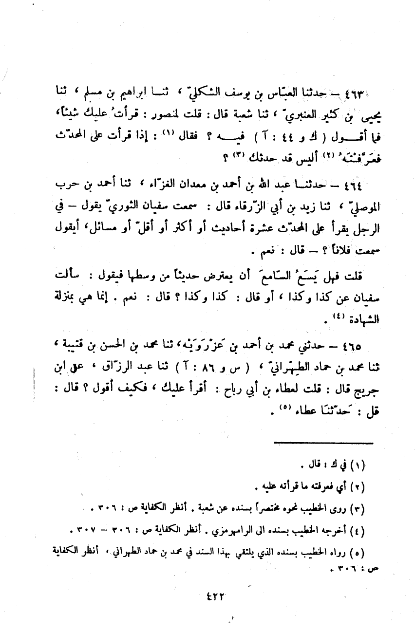 حَدَّثَنَا الْعَبَّاسُ بْنُ يُوسُفَ الشَّكْلِيُّ، ثَنَا إِبْرَاهِيمُ بْنُ مُسْلِمٍ، ثَنَا يَحْيَى بْنُ كَثِيرٍ الْعَنْبَرِيُّ، ثَنَا شُعْبَةُ قَالَ: قُلْتُ لِمَنْصُورٍ: قَرَأْتُ عَلَيْكَ شَيْئًا، فَمَا أَقُولُ فِيهِ؟ فَقَالَ: «§إِذَا قَرَأْتَ عَلَى الْمُحَدِّثِ فَعَرَّفْتَهُ، أَلَيْسَ قَدْ حَدَّثَكَ؟»
